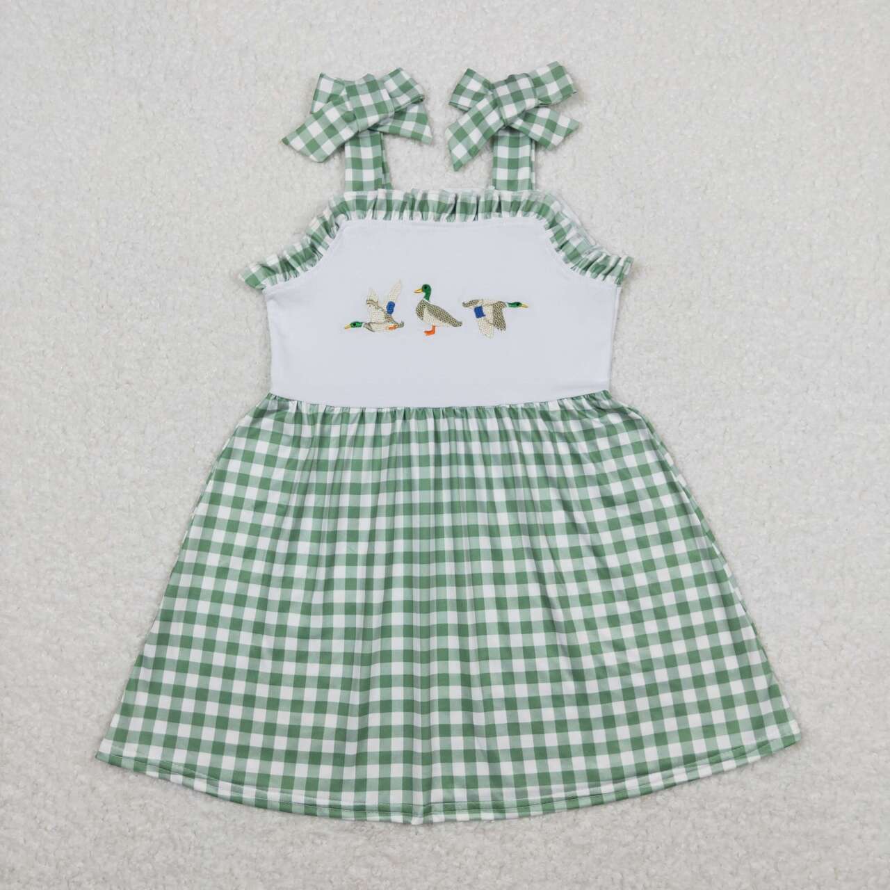 GSD0839 Duck Embroidery Green Plaid Print Girls Summer Knee Length Strap Dress