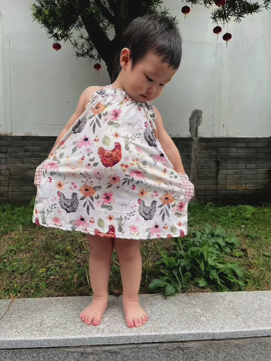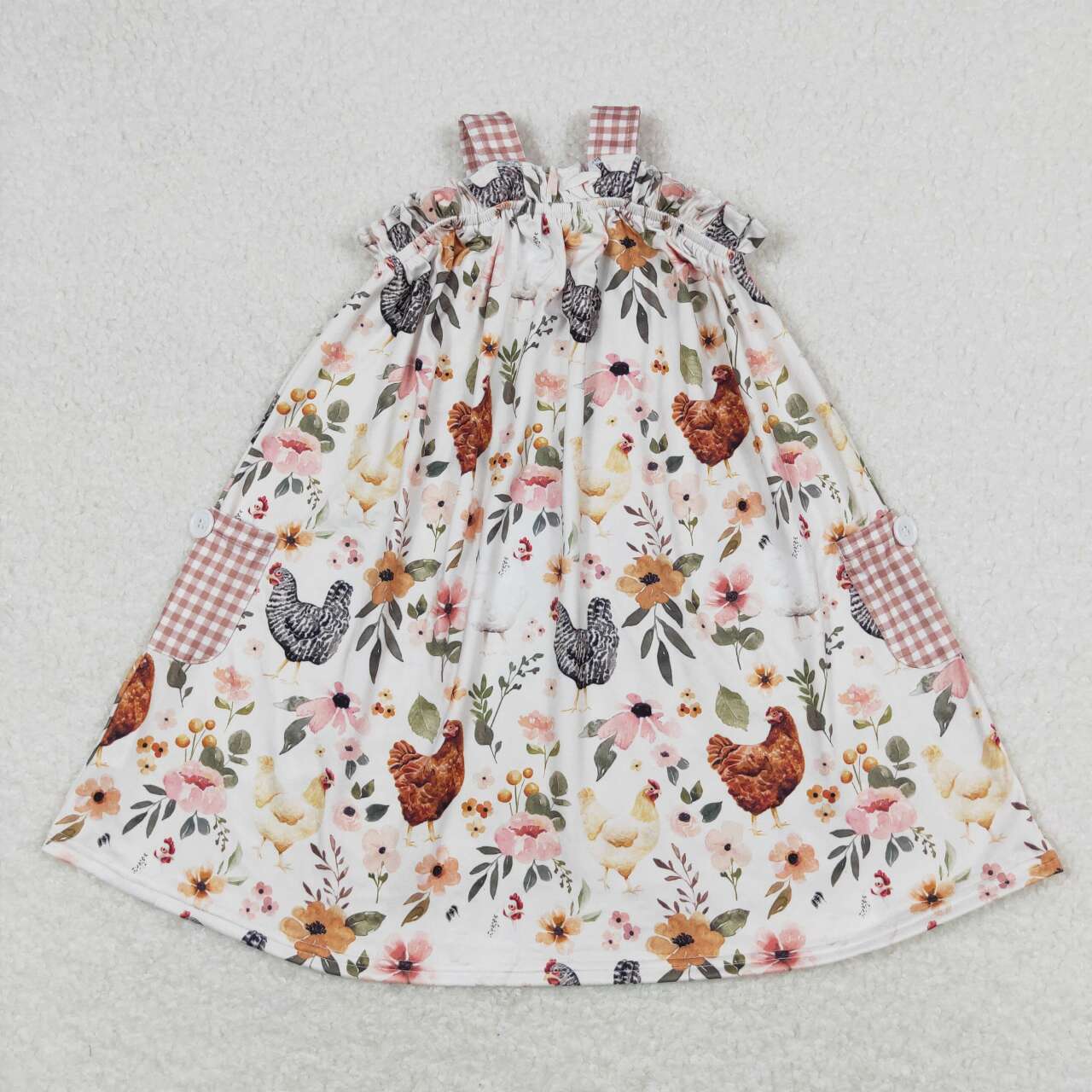 GSD0841 Chicken Flowers Print Pockets Girls Summer Knee Length Dress
