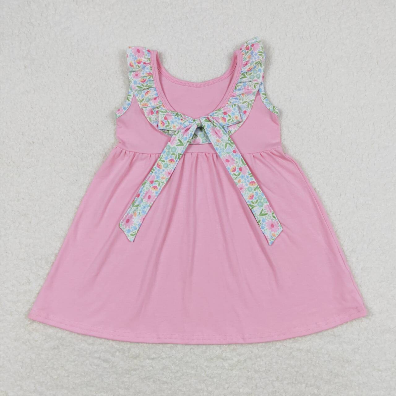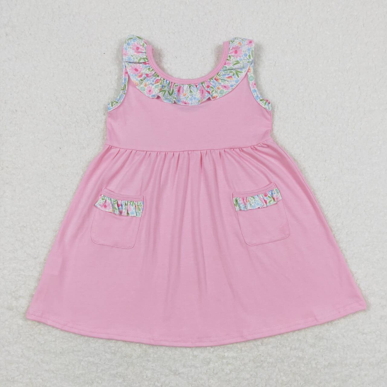 GSD0961 Flowers Print Pockets Pink Backless Girls Knee Length Summer Dress