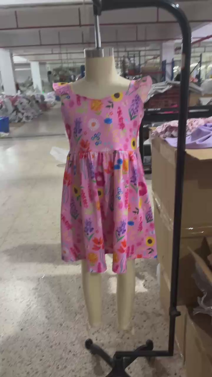 GSD2208 Colorful Flowers Pink Print Girls Backless Knee Length Dress