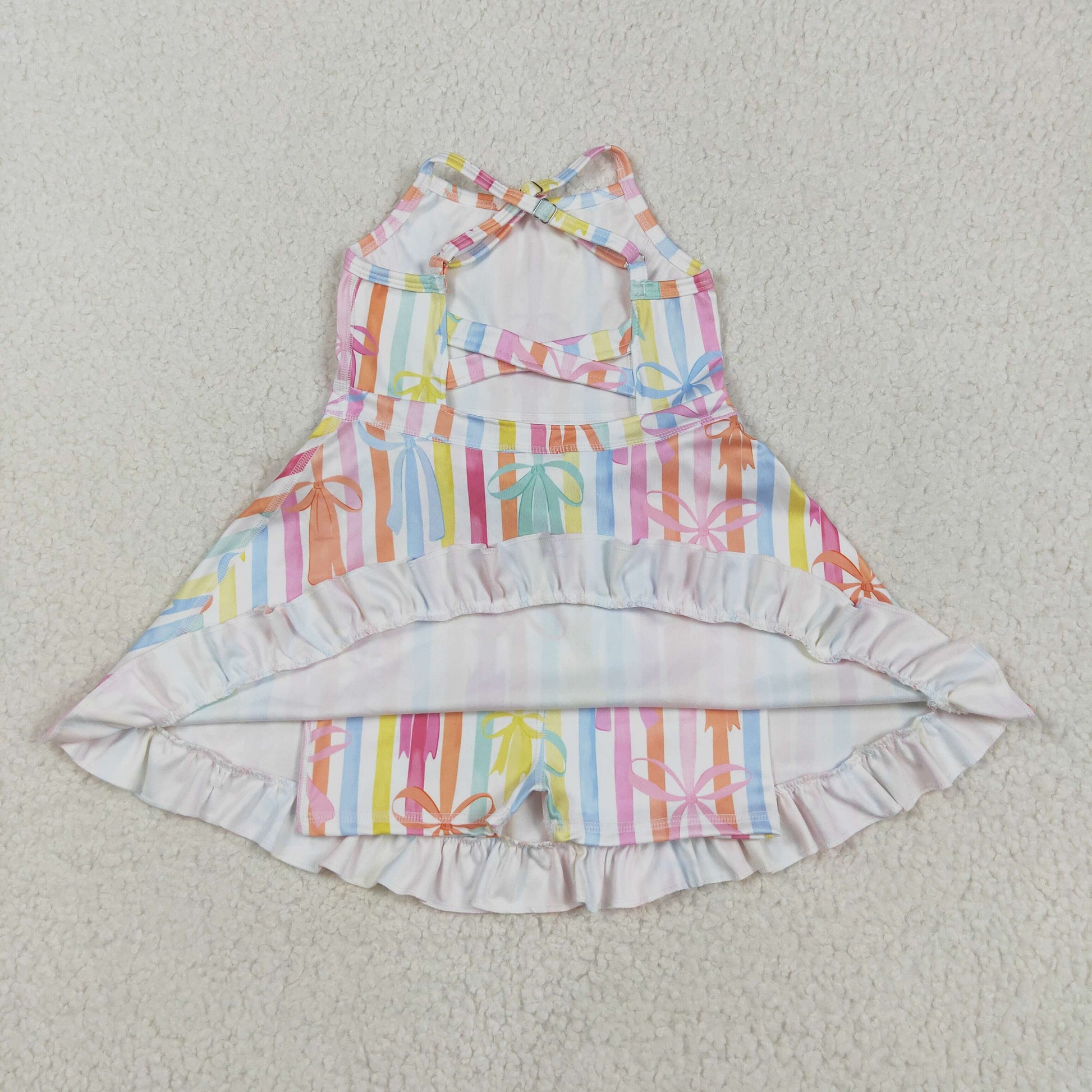 GSD2288 Colorful Bows Stripes Print Girls Summer Knee Length Shorts Yoga Dress