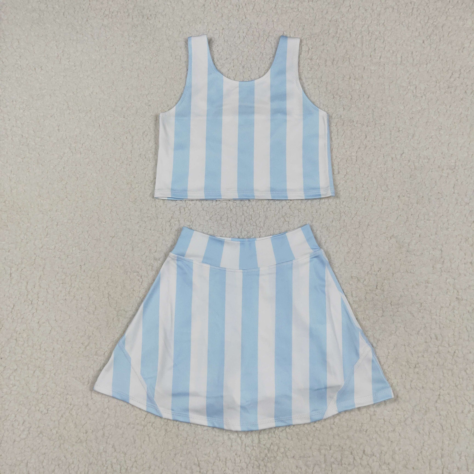 GSD2433 Blue Stripes Tank Top Skirts Shorts Girls Summer Yoga Clothes Set