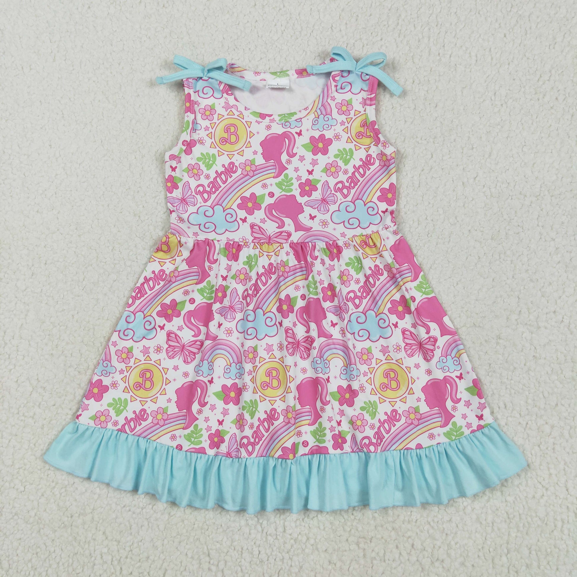 GSD2463 Rainbow Pink BA Flowers Print Girls Summer Knee Length Dress