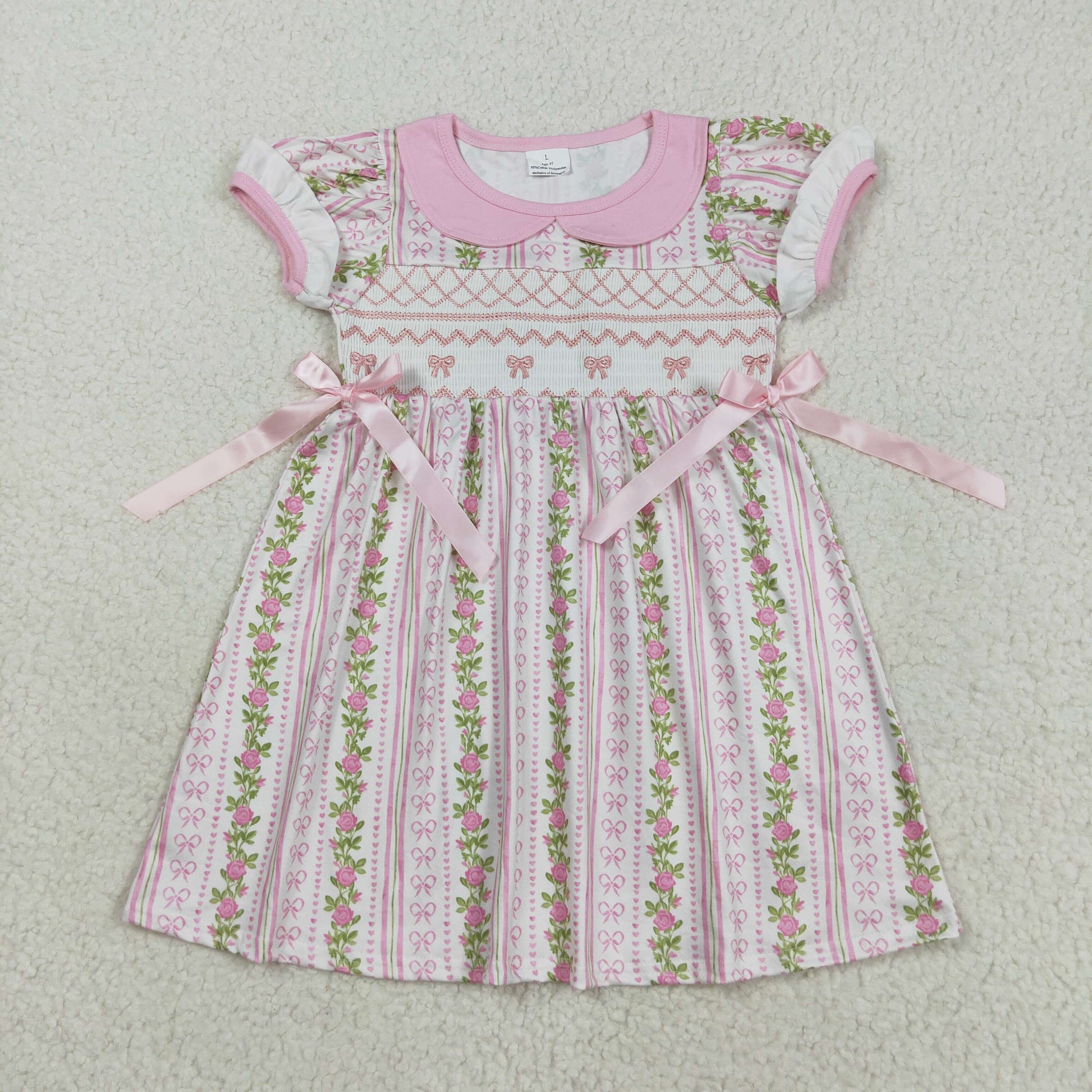 GSD2717 Bows Embroidery Pink Flowers Print Girls Summer Knee Length Smocked Dress