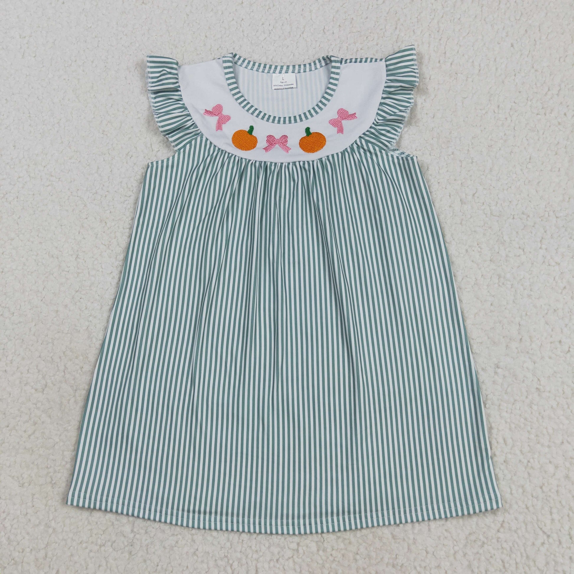 GSD2746 Pumpkin Bows Embroidery Green Stripes Girls Fall Knee Length Dress