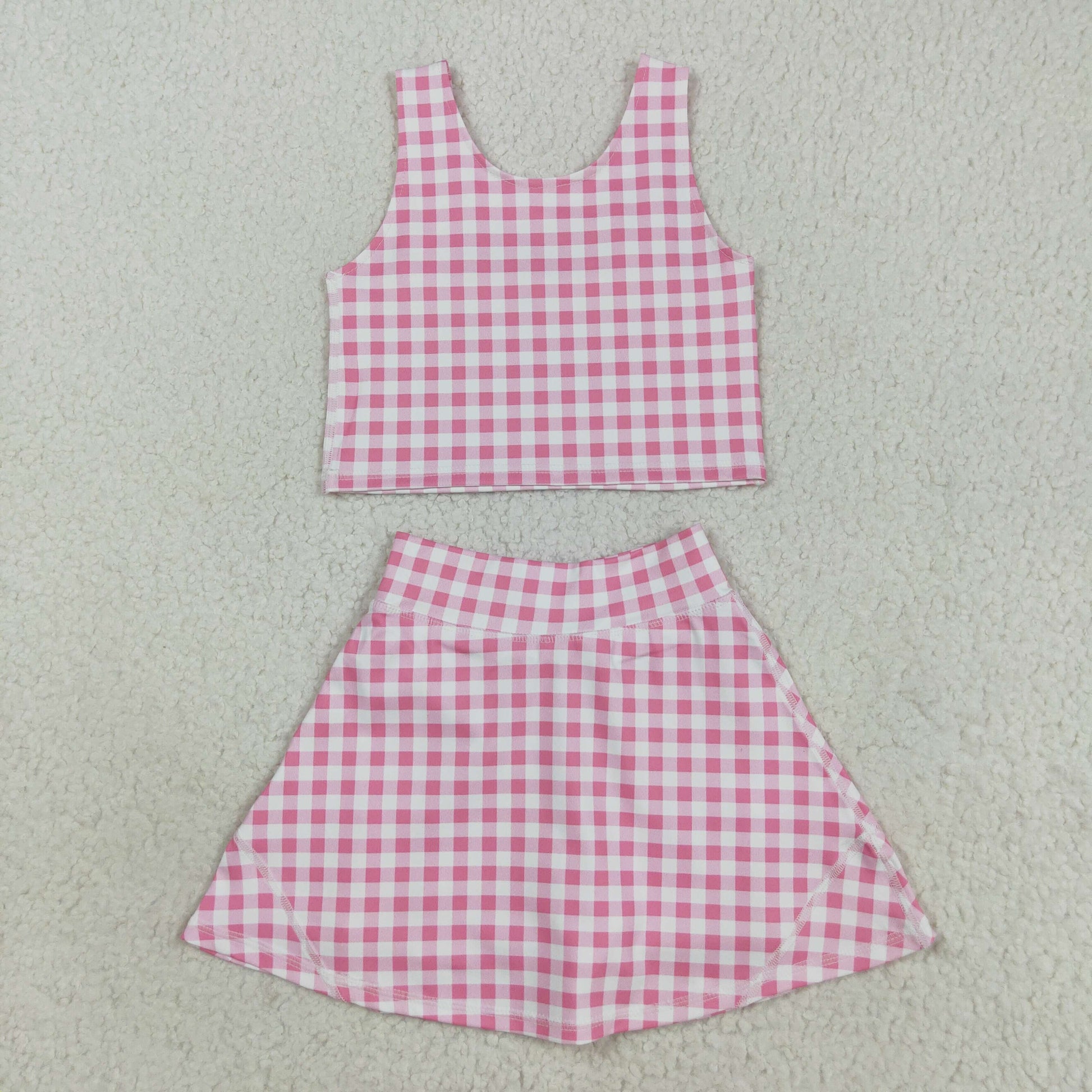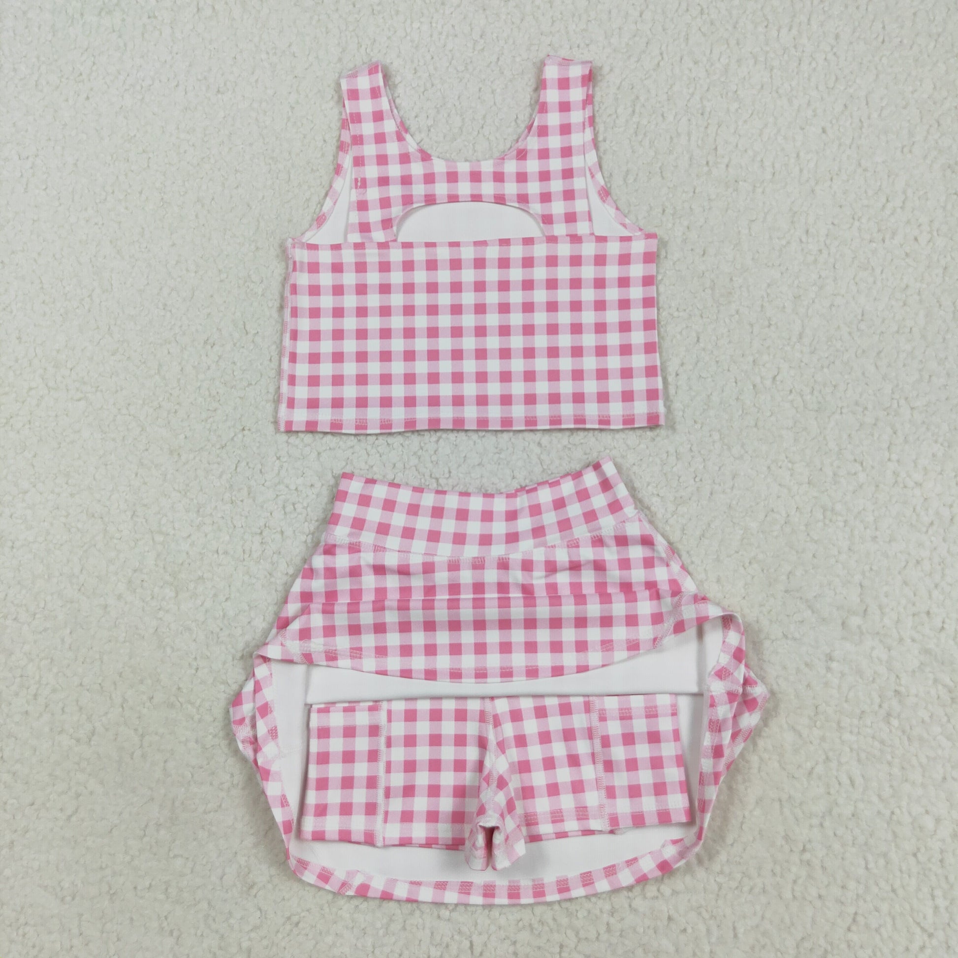 GSD2786 Pink Plaid Tank Top Skirts Shorts Girls Summer Yoga Clothes Set