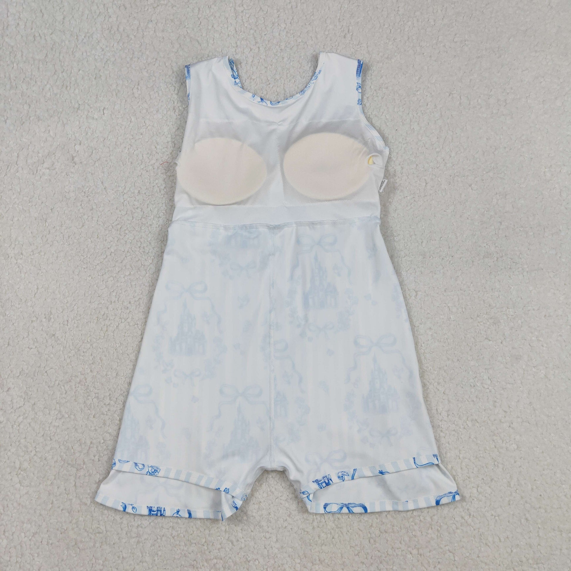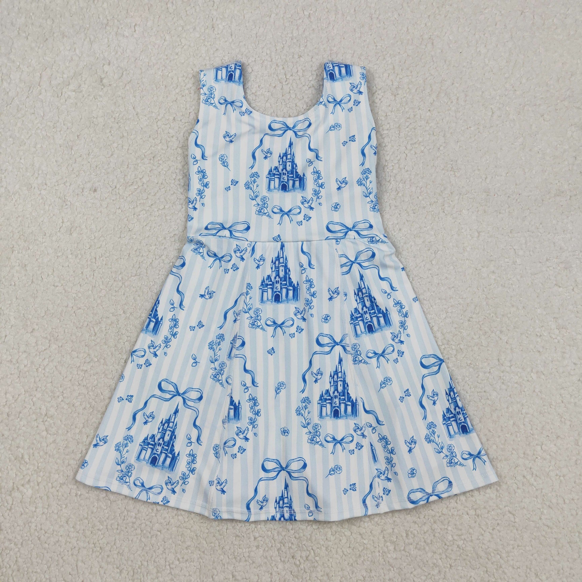 GSD3068 Blue Flowers Castle Bows Print Girls Summer Shorts Knee Length Yoga Dress