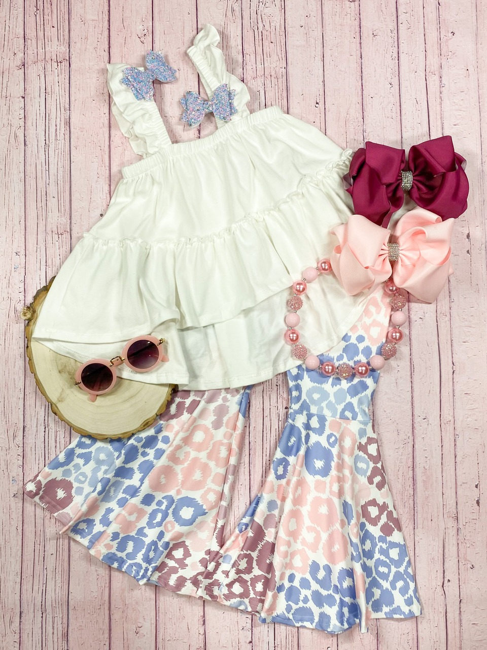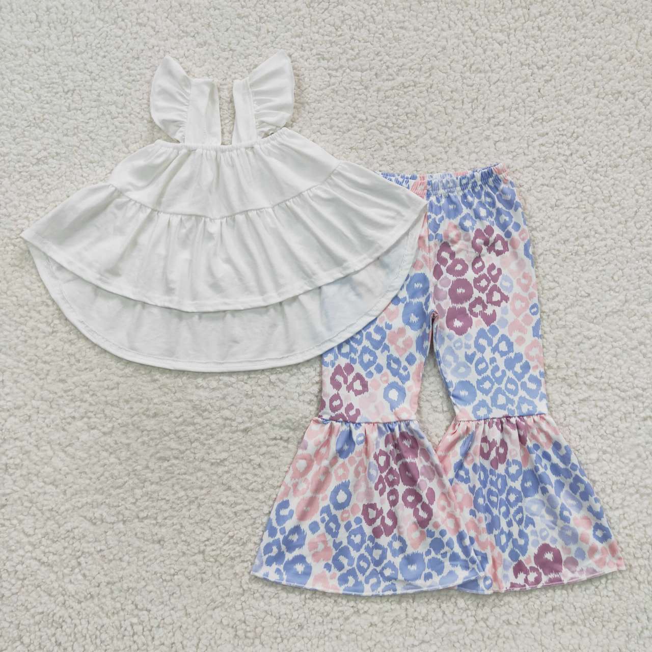 GSPO0678 White cotton strap ruffle top pink leopard bell pants girls clothes set
