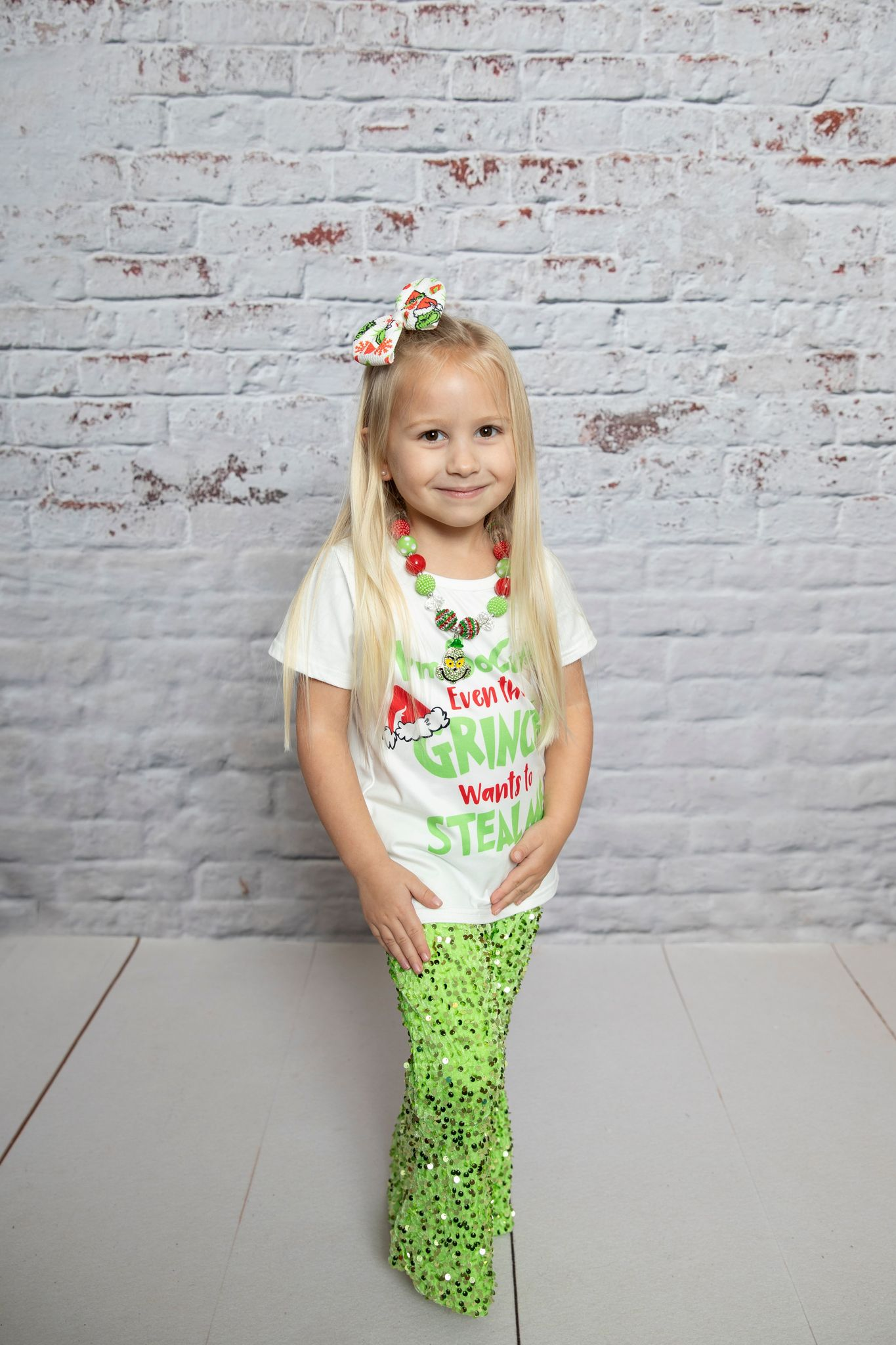 GSPO0721 Christmas top green sequin bell bottom pants girls clothes set