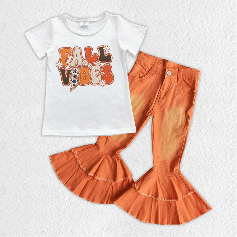 GSPO0867 Fall flowers top orange denim bell bottom jeans girls clothes set