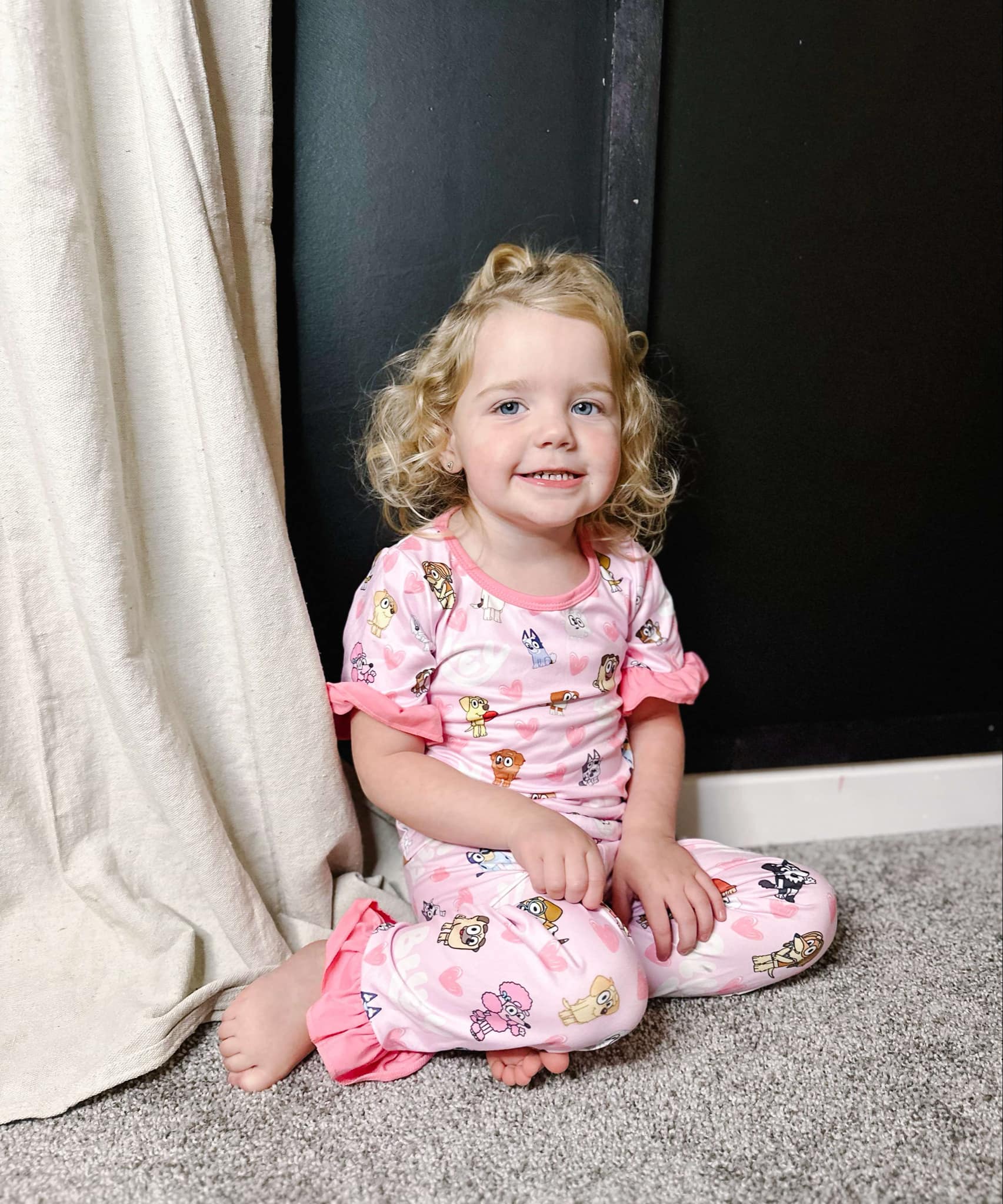 GSPO1760 Cartoon Dog Heart Pink Print Girls Valentine's Day Pajamas Clothes Set
