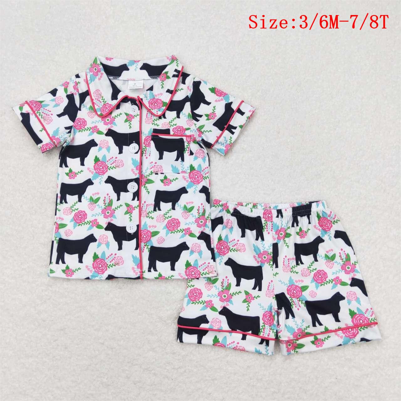 GSSO0590 Flowers Cow Print Girls Summer Pajamas Clothes Set