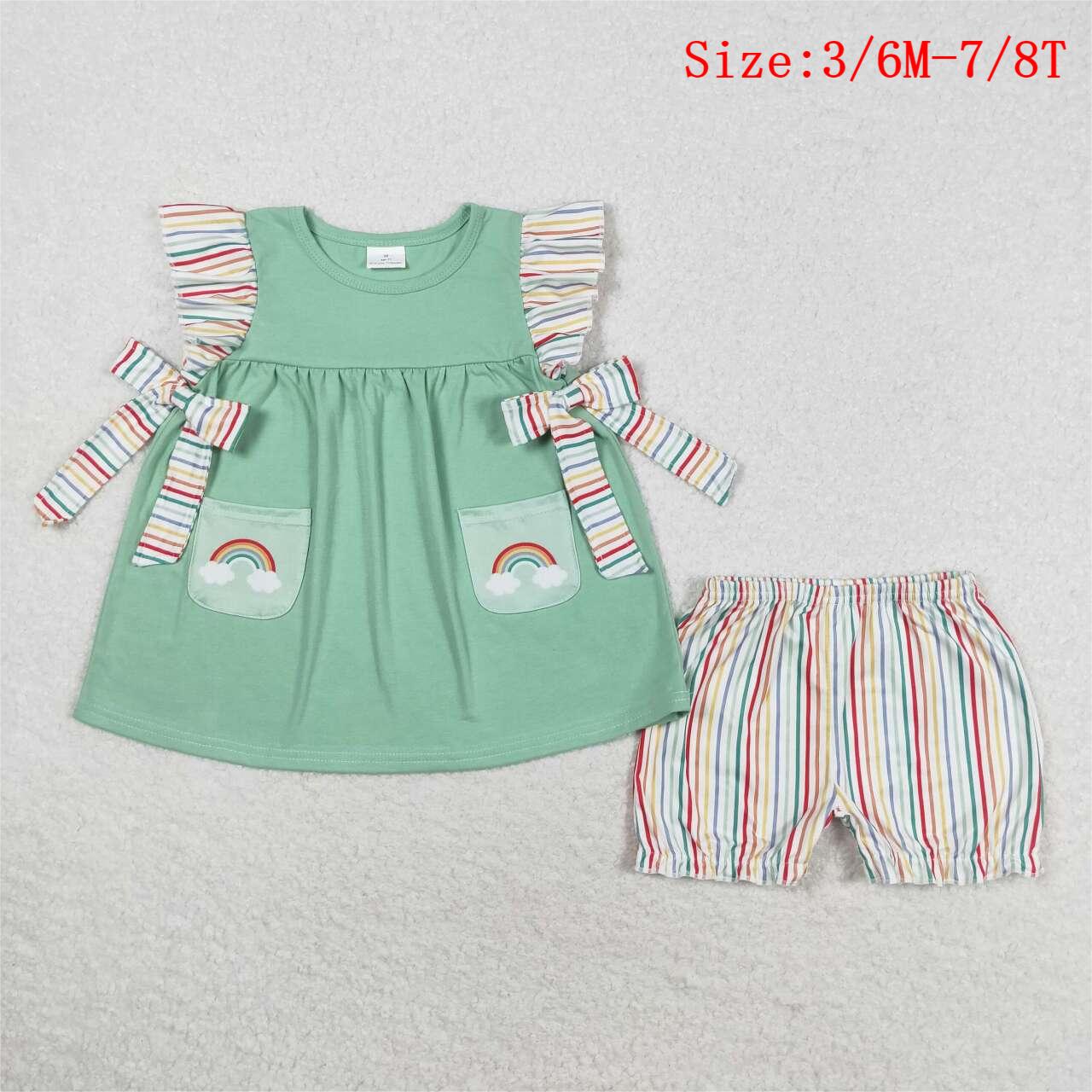 GSSO0596 Rainbow Pockets Green Tunic Top Stripes Shorts Girls Summer Clothes Set