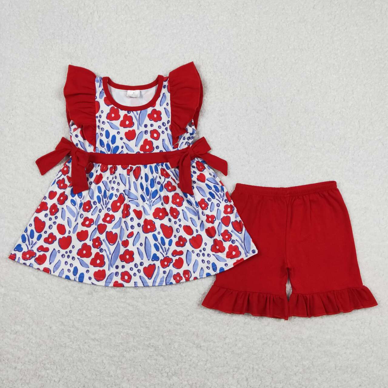 GSSO0609 Red Flowers Tunic Top Ruffle Shorts Girls Summer Clothes Set