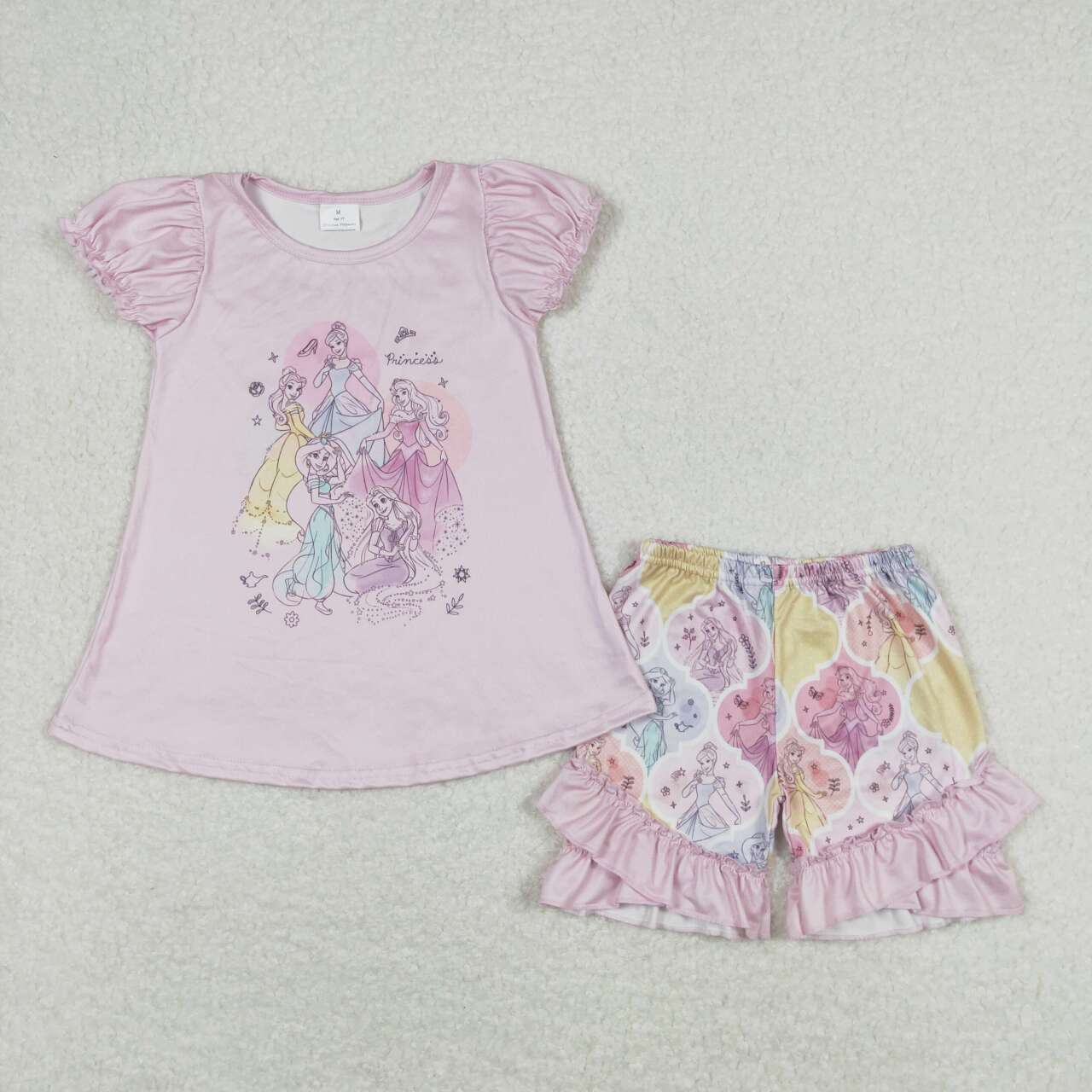 GSSO0821 Pink Cartoon Princess Print Girls Summer Clothes Set
