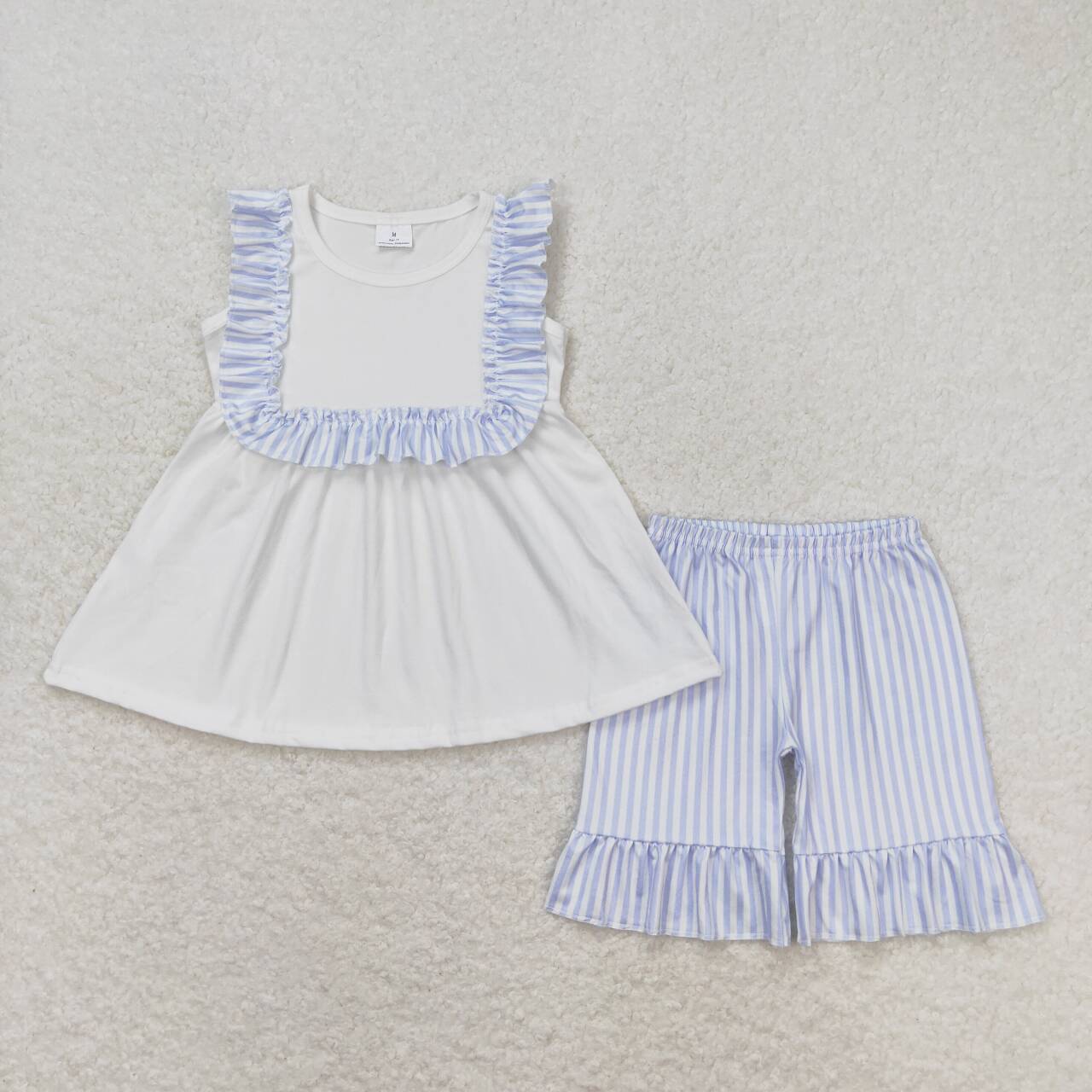 GSSO0926 White Tunic Top Blue Stripes Shorts Girls Summer Clothes Set