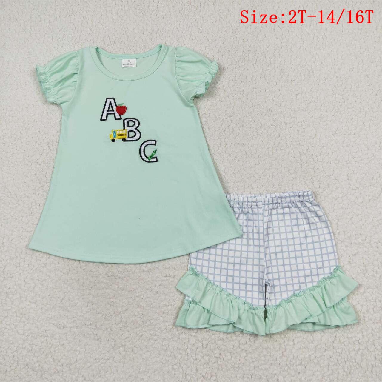 GSSO0930 ABC Embroidery Top Plaid Shorts Girls Back to School Clothes Set