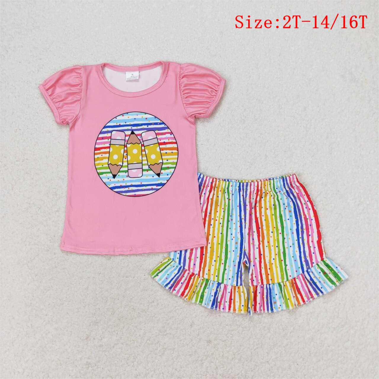 GSSO1366 Pen Pink Top Rainbow Stripes Shorts Girls Back to School Clothes Set
