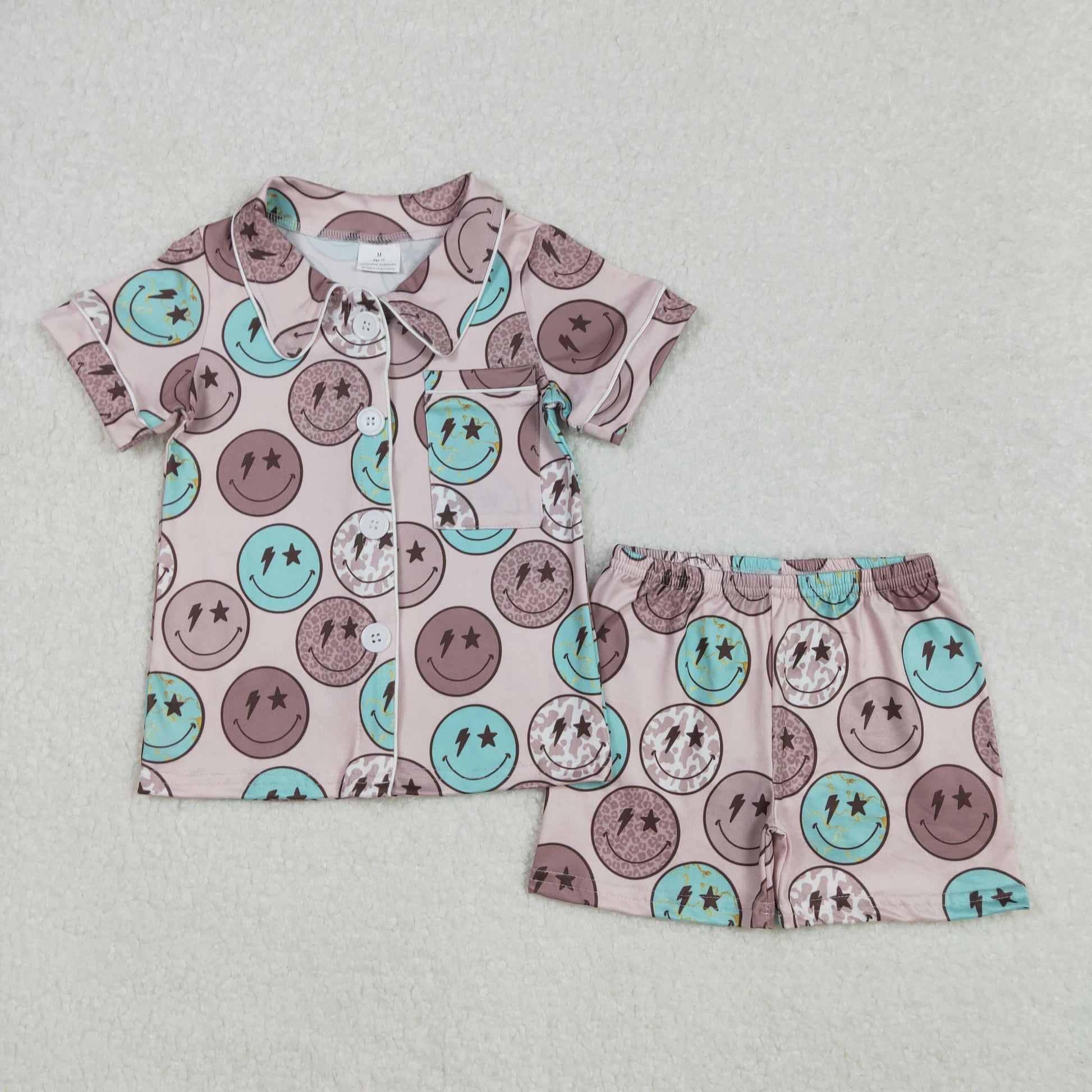 GSSO1545 Smiling Face Brown Print Kids Western Summer Buttons Pajamas Clothes Set