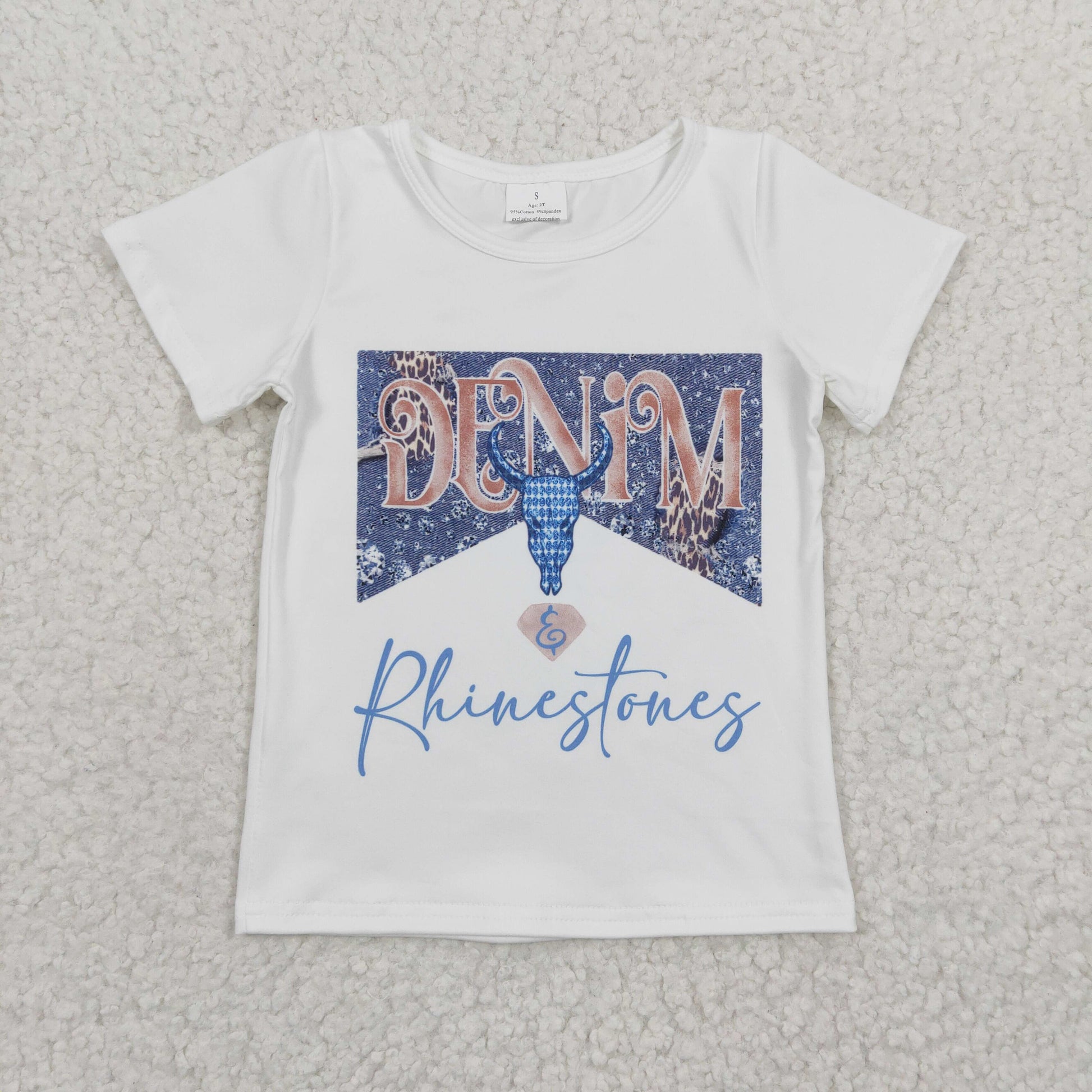 GT0133+P0457 Cow Skull Top Blue Denim Bell Jeans Girls Clothes Set
