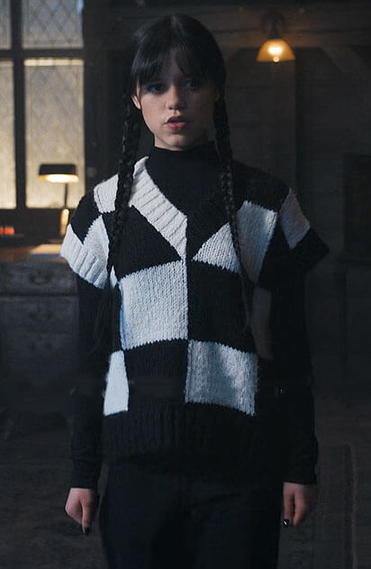 GT0187 Black white gingham vest Wednesday design kids fall sweater