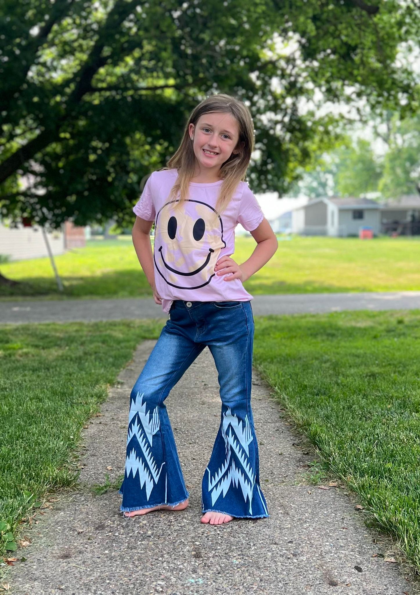GT0192+P0126 Pink Smiling Top Blue Bleached Denim Bell Jeans Girls Clothes Set