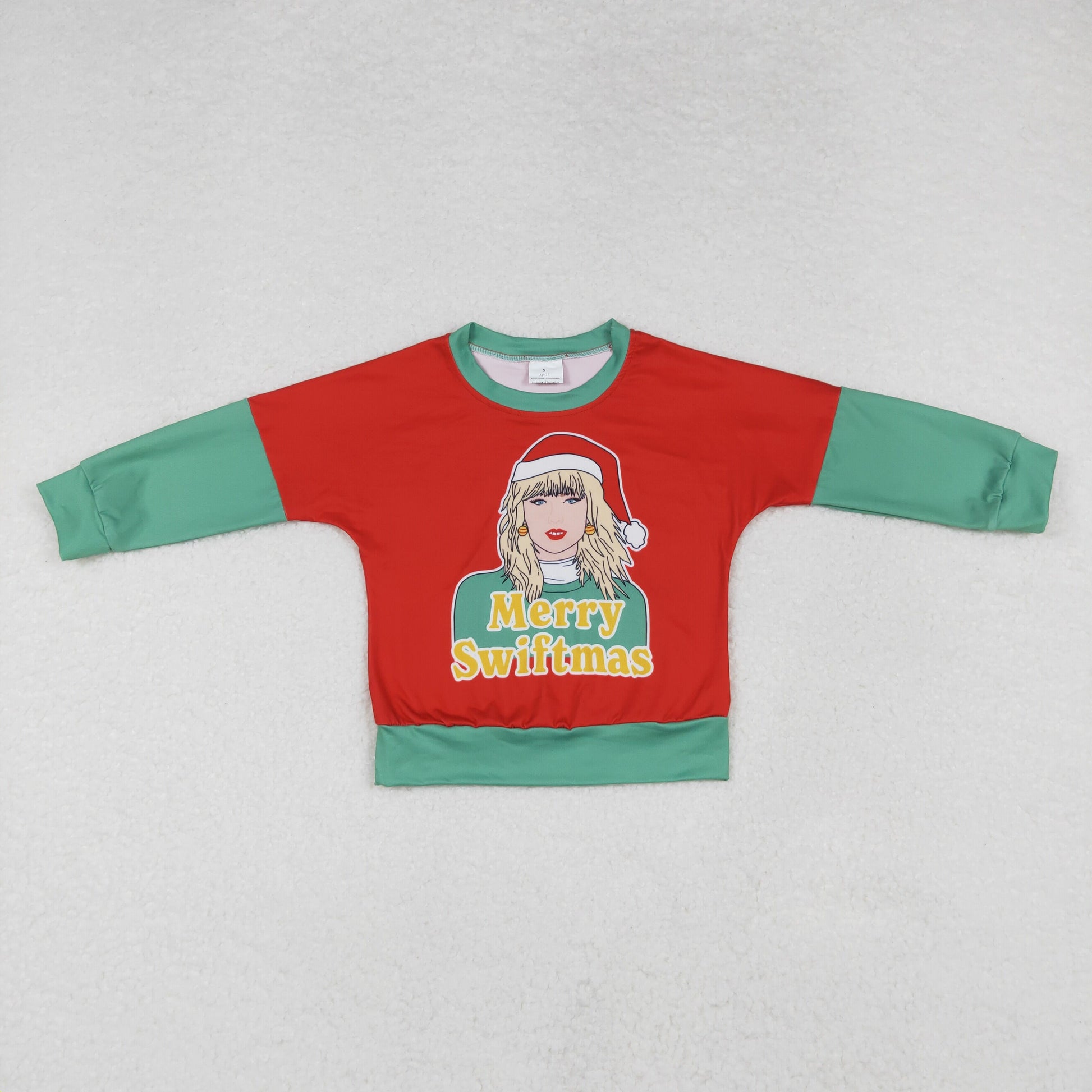 GT0704 Merry Swiftmas Print Green Sleeve Girls Christmas Tee Shirts Top