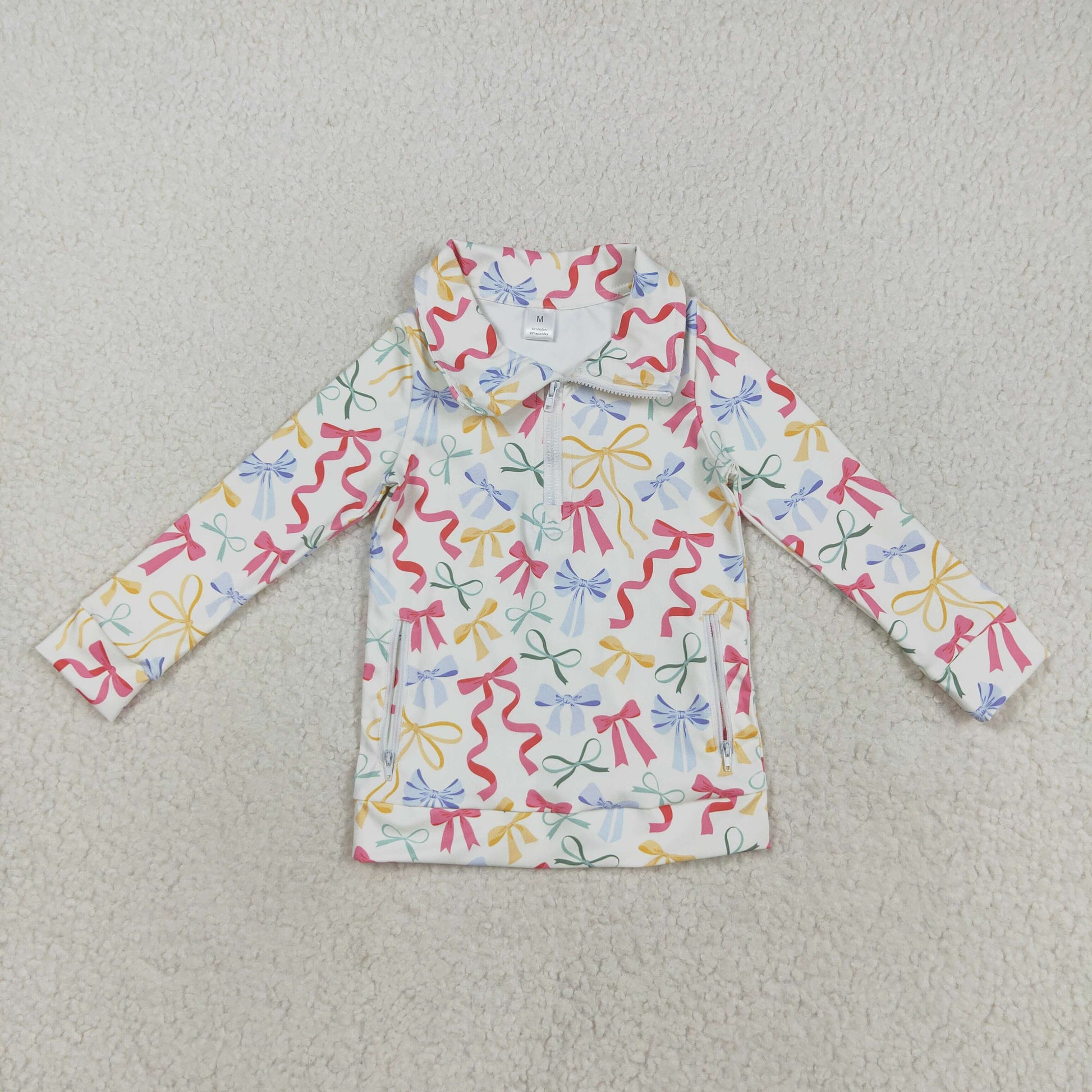 GT1065 Colorful Bows Print Pockets Girls Yoga Zipper Pullover Top
