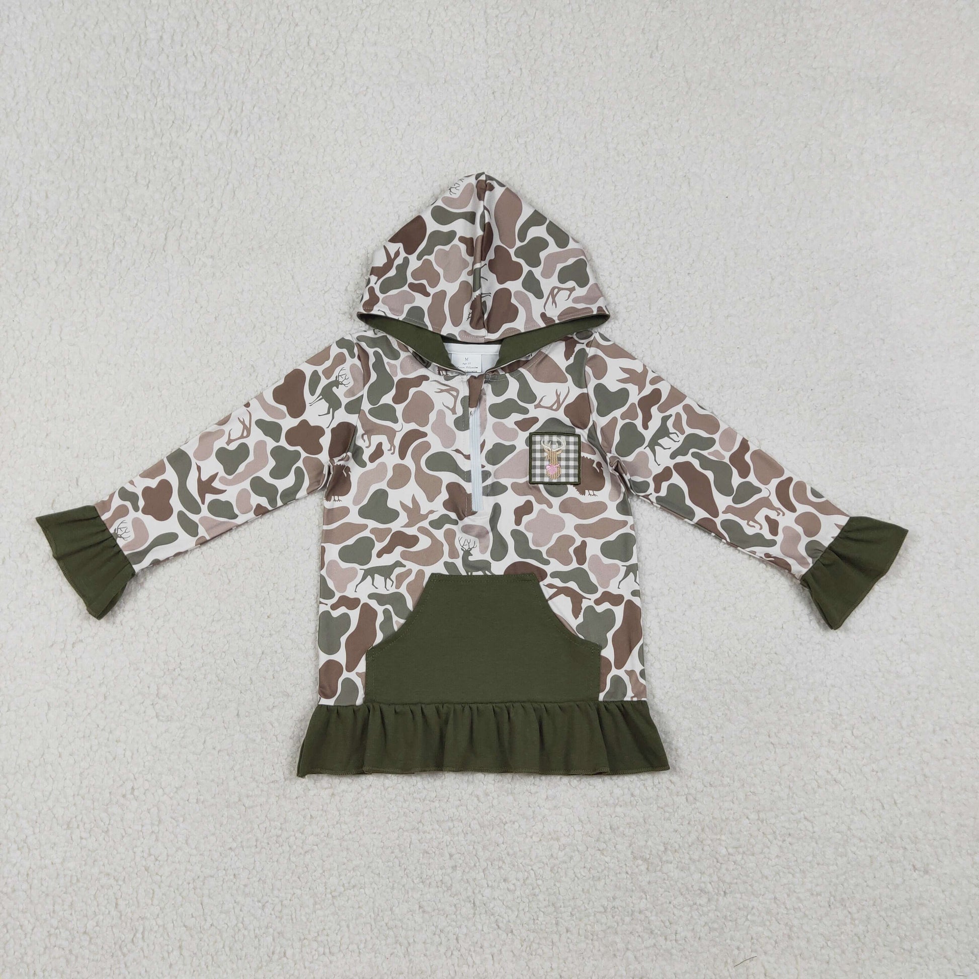 GT1136 Deer Embroidery Camo Print Girls Fall Pocket Zipper Hoodie Top