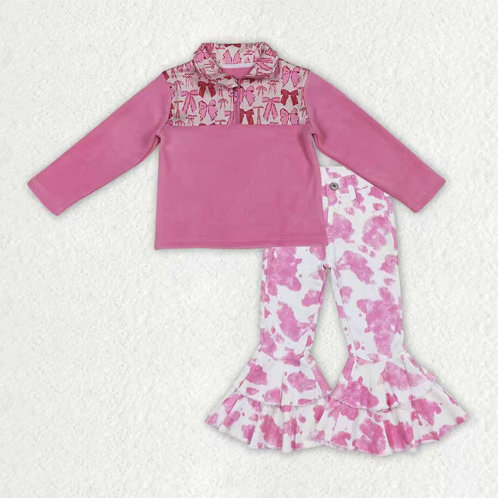 GT1149+P0406 Pink Bows Zipper Thick Pullover Top Tie-dye Denim Bell Jeans Girls Clothes Set