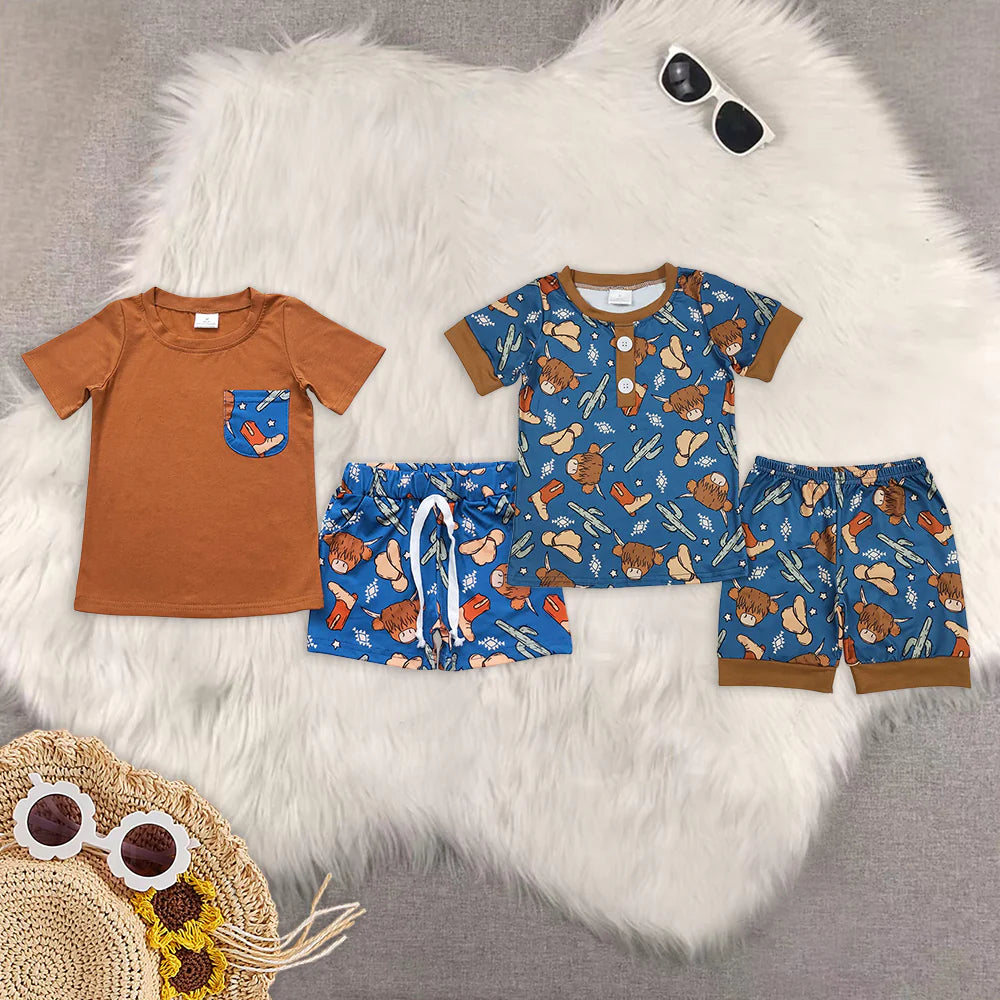 Highland Cow Cactus Print Shorts Boys Summer Clothes Set Brothers Wear