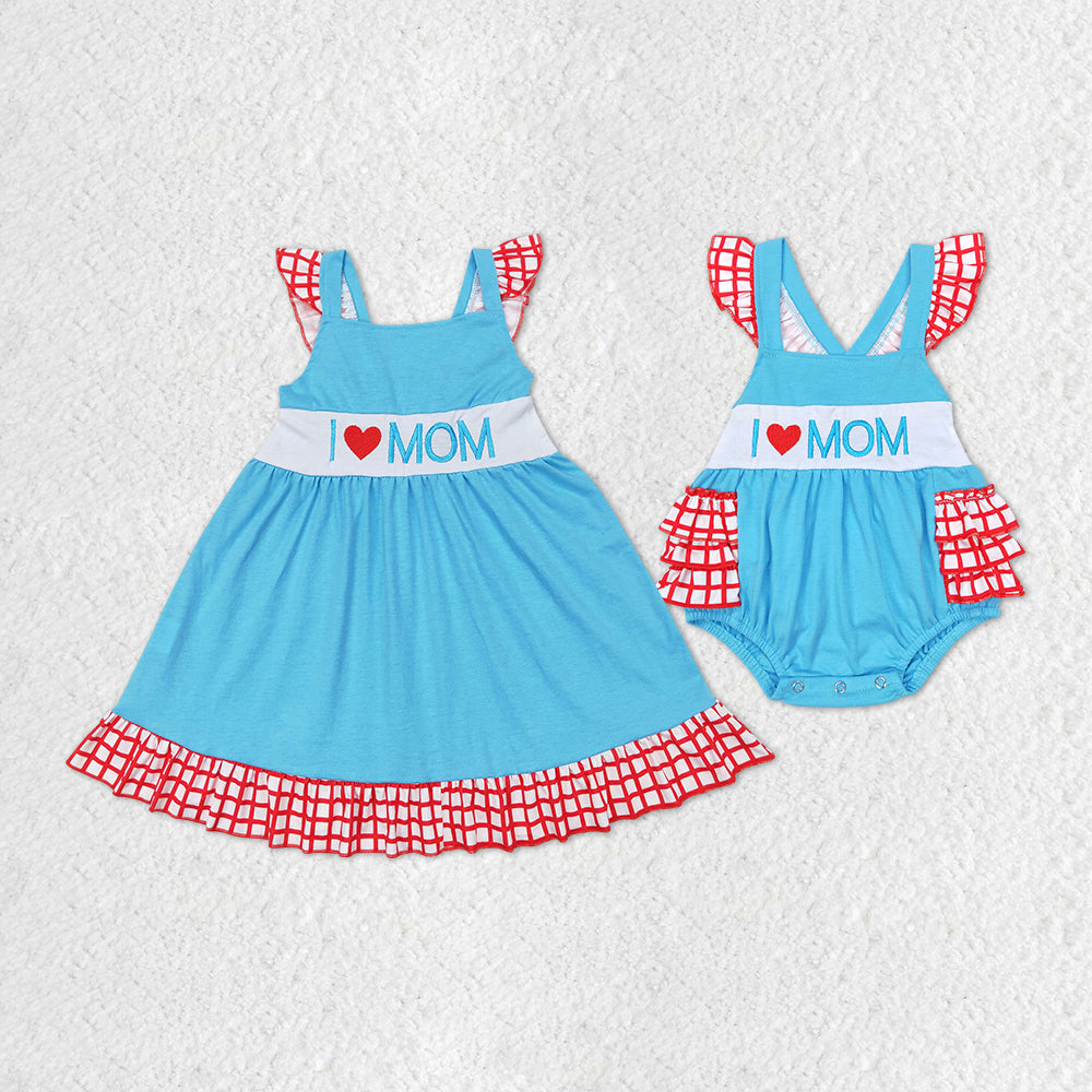 I LOVE MOM Embroidery Blue Sisters Mother's Day Matching Clothes