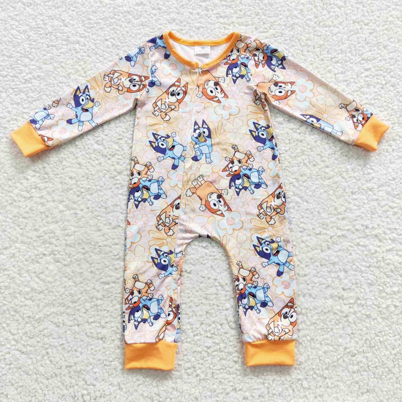 LR0360 Baby girls orange flowers cartoon dog zipper romper
