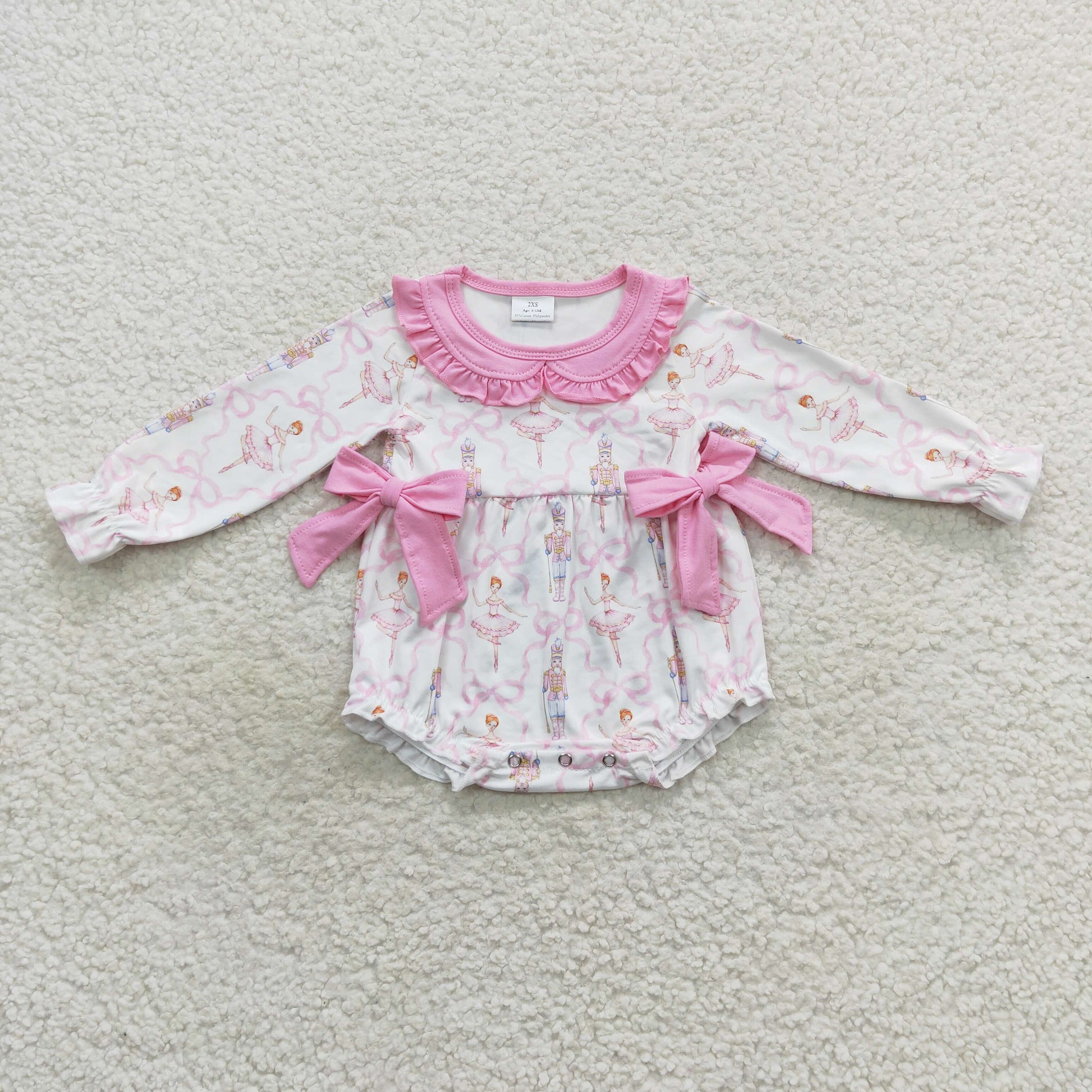 LR0586 Pink Christmas soldier print bows baby girls romper