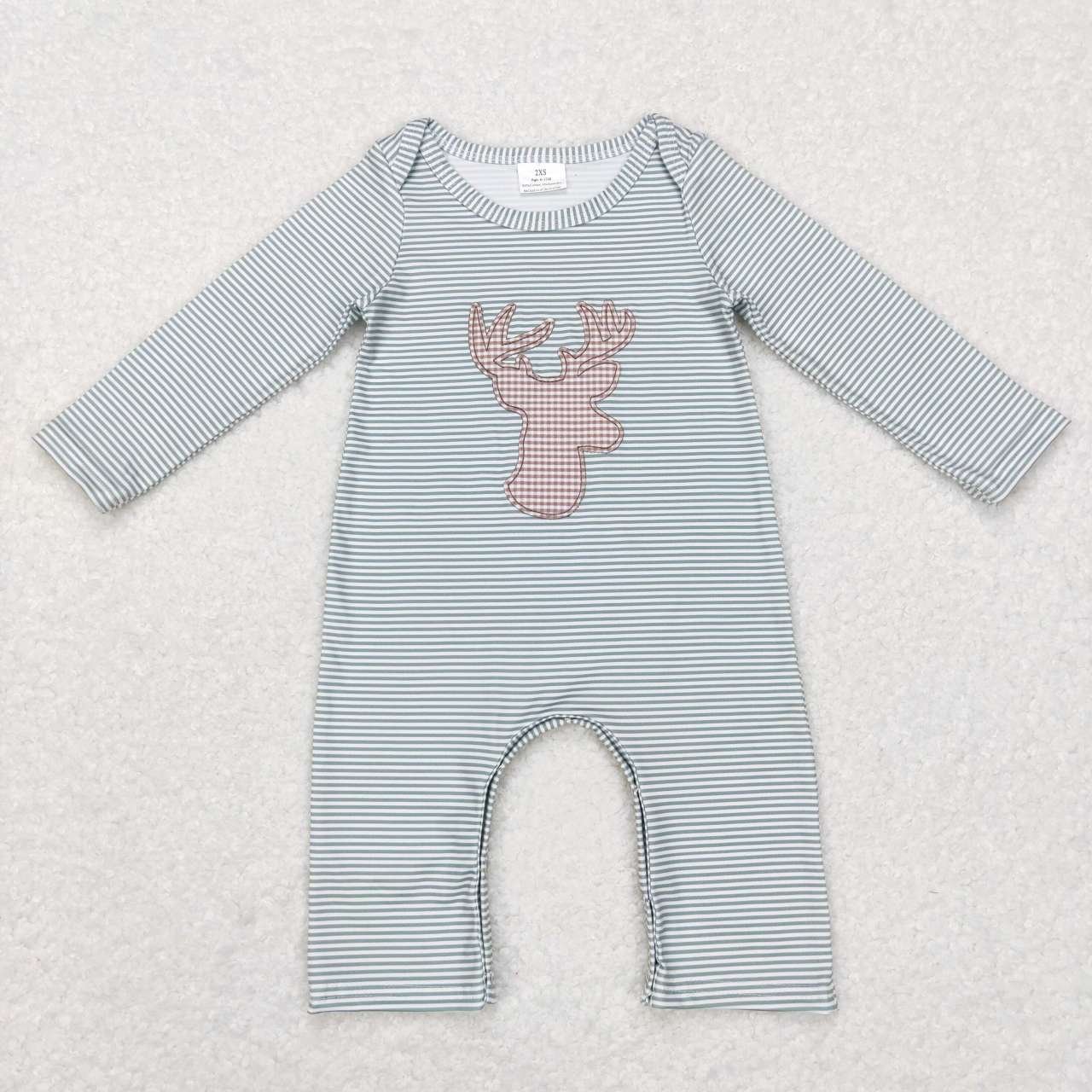 LR0694 Grey Stripes Dear Embroidery Print Baby Boys Romper