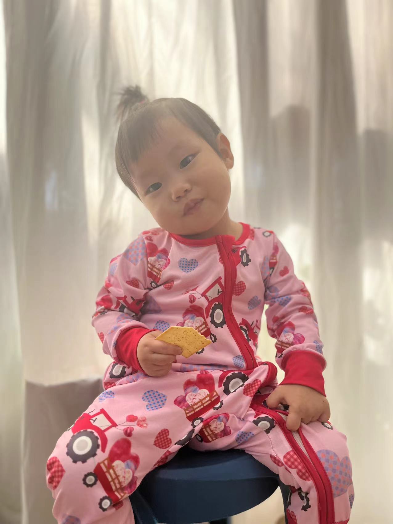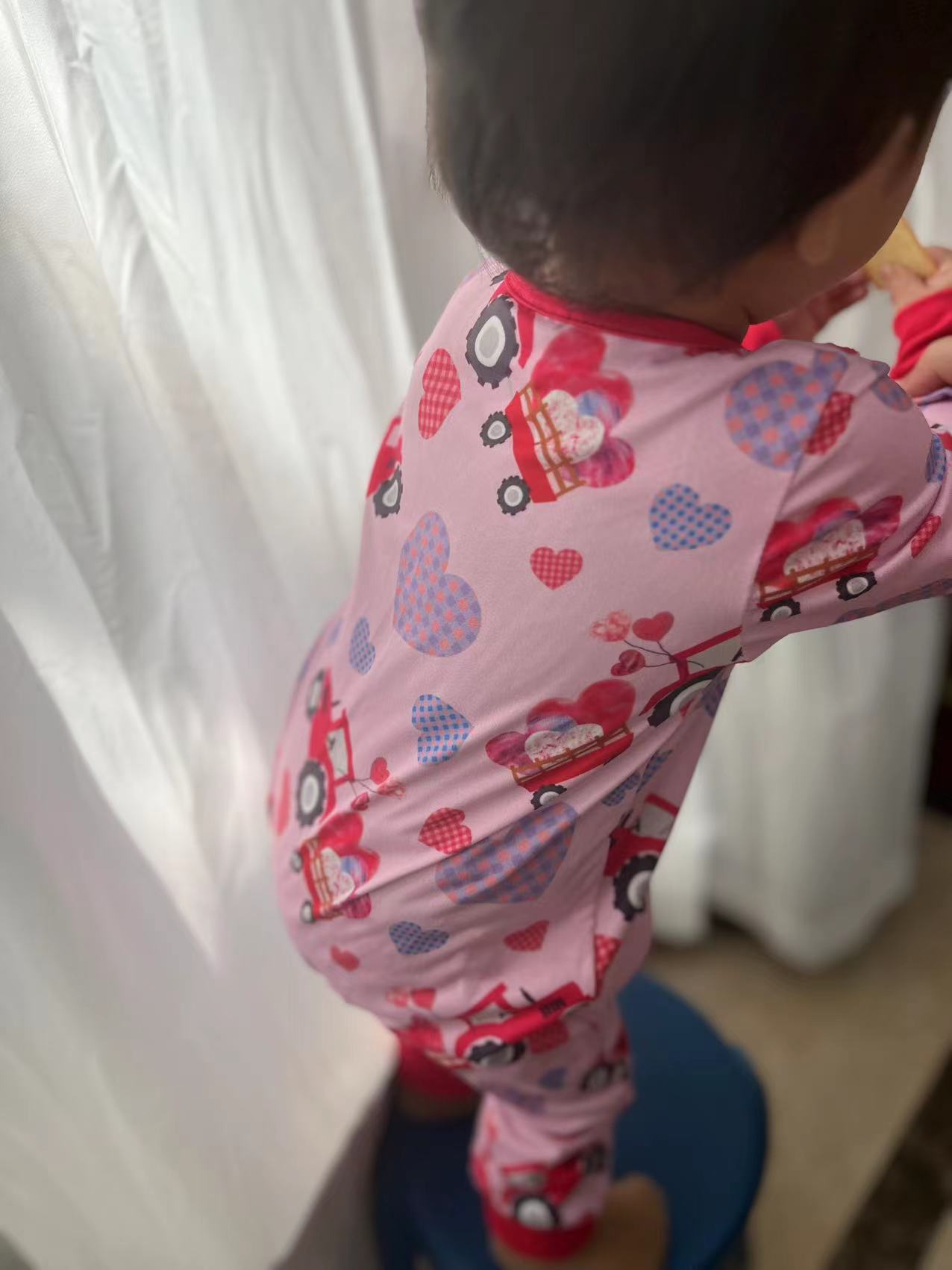 LR0774 Pink Truck Heart Print Baby Girls Valentine's Day Zipper Romper