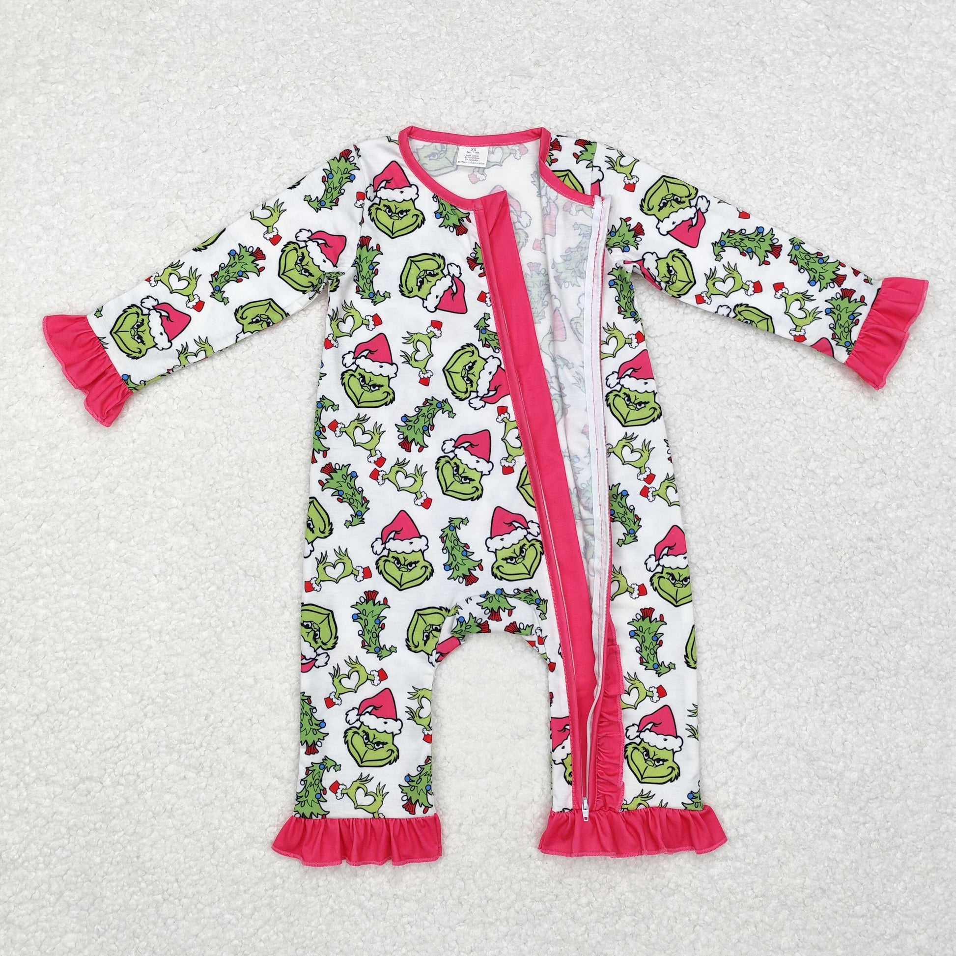 LR1337 Green Frog Face Print Baby Girls Christmas Bamboo Sleeper Zipper Romper