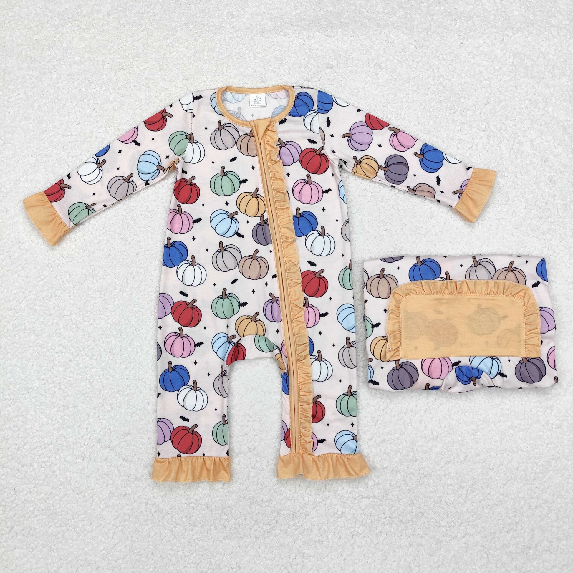 LR1455 Colorful Pumpkin Print Baby Girls Fall Sleeper Zipper Romper