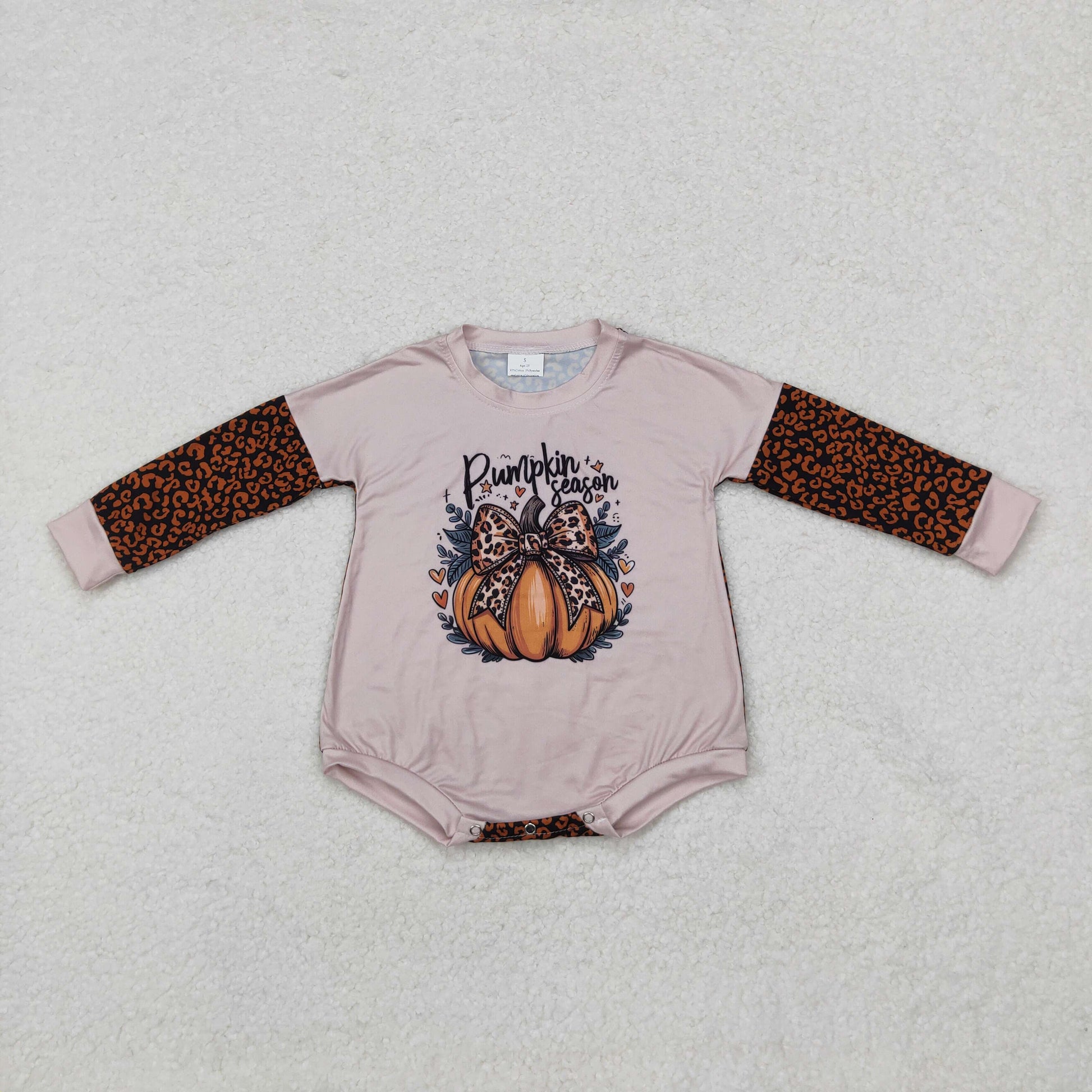 LR1723 Pumpkin Leopard Bows Print Baby Girls Fall Romper