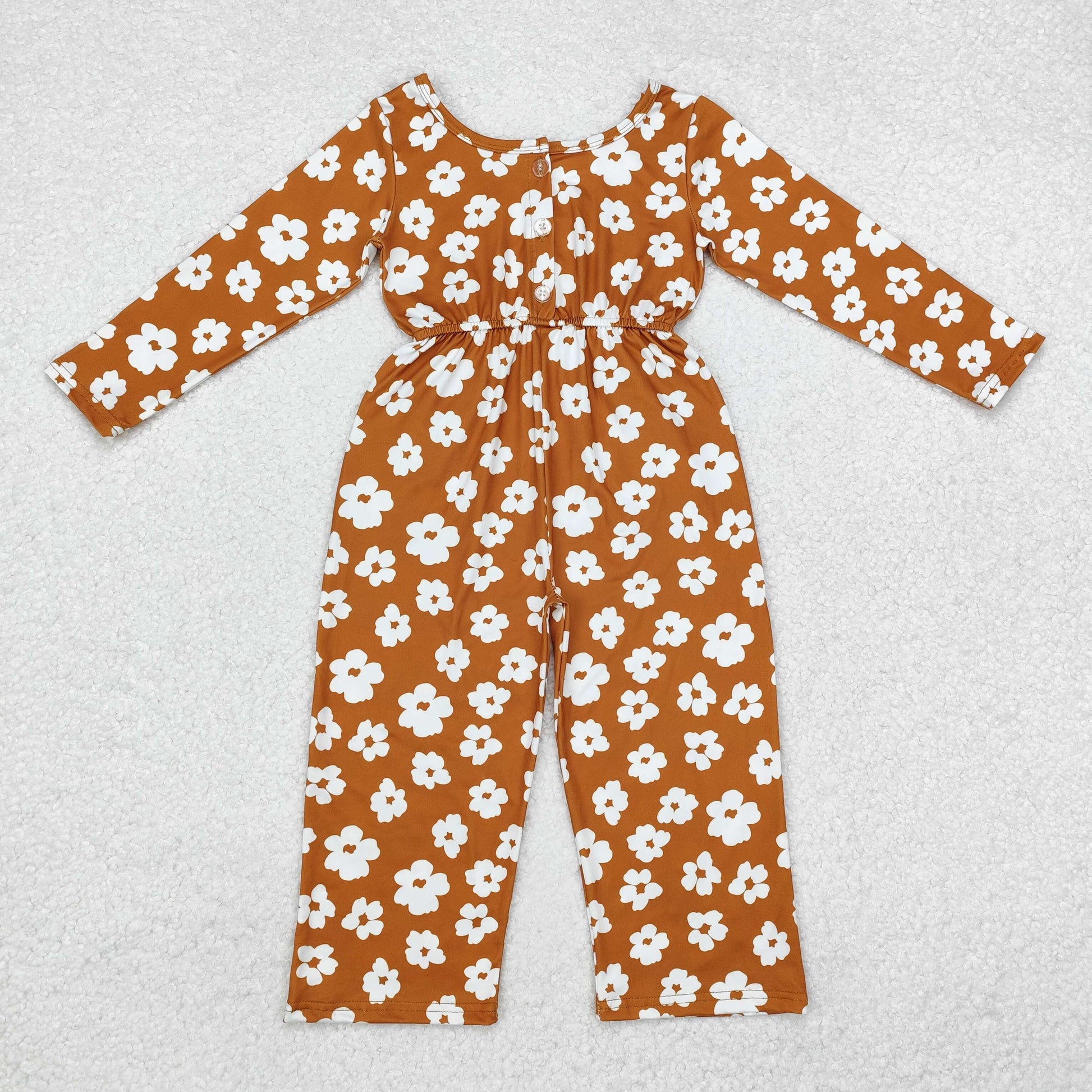 LR1838 Brown Flowers Print Girls Fall Pockets Jumpsuits