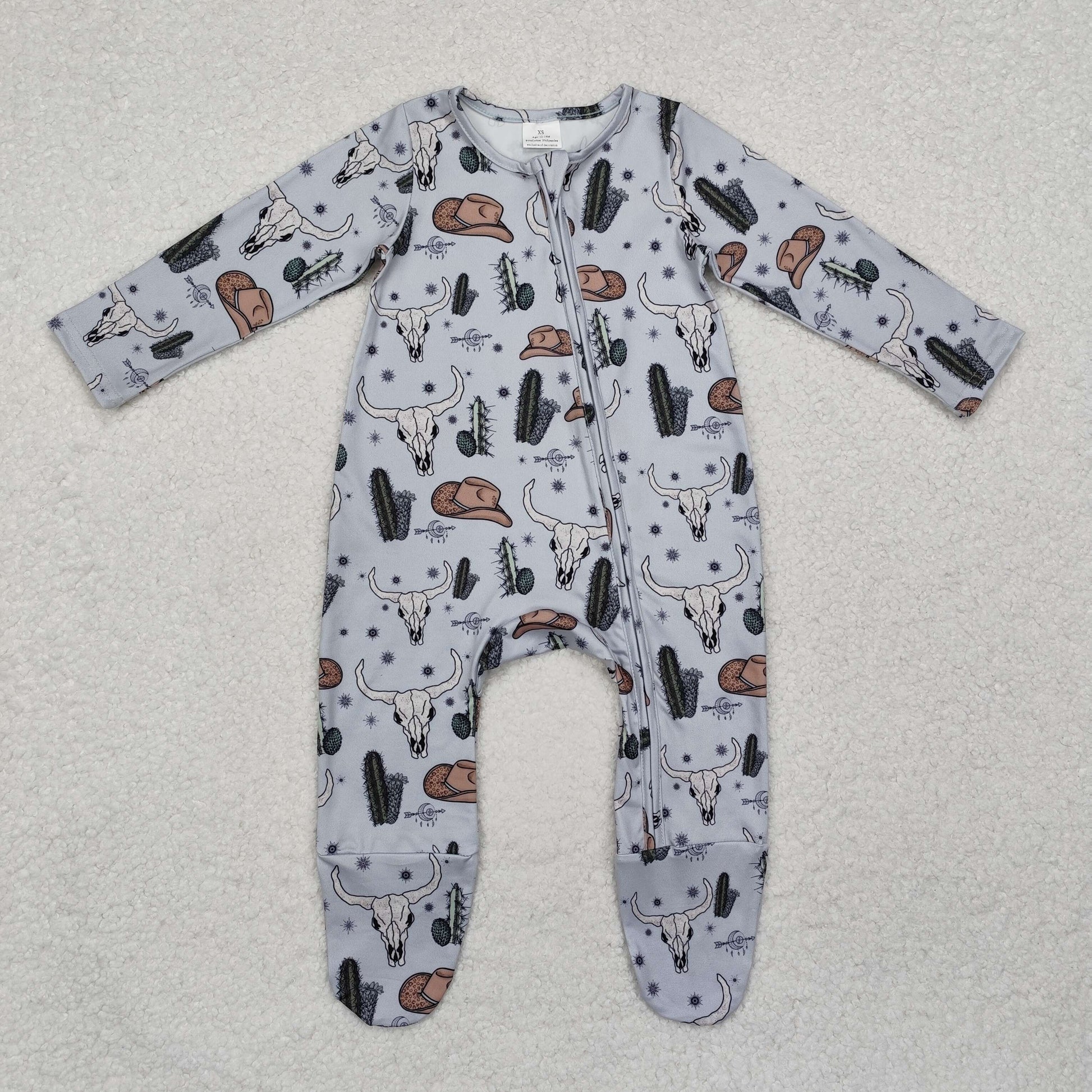 LR2098 Cow Skull Hat Cactus Print Baby Boys FOOTED Western Zipper Sleeper Romper