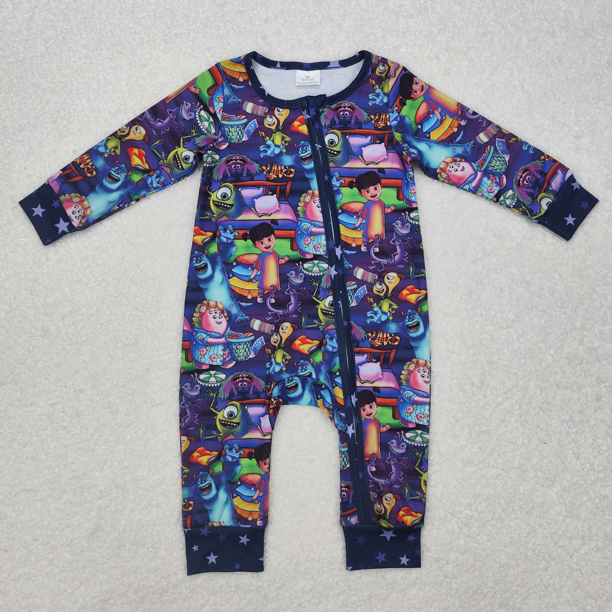 LR2164 Cartoon Monster Print Baby Girls Sleeper Zipper Romper