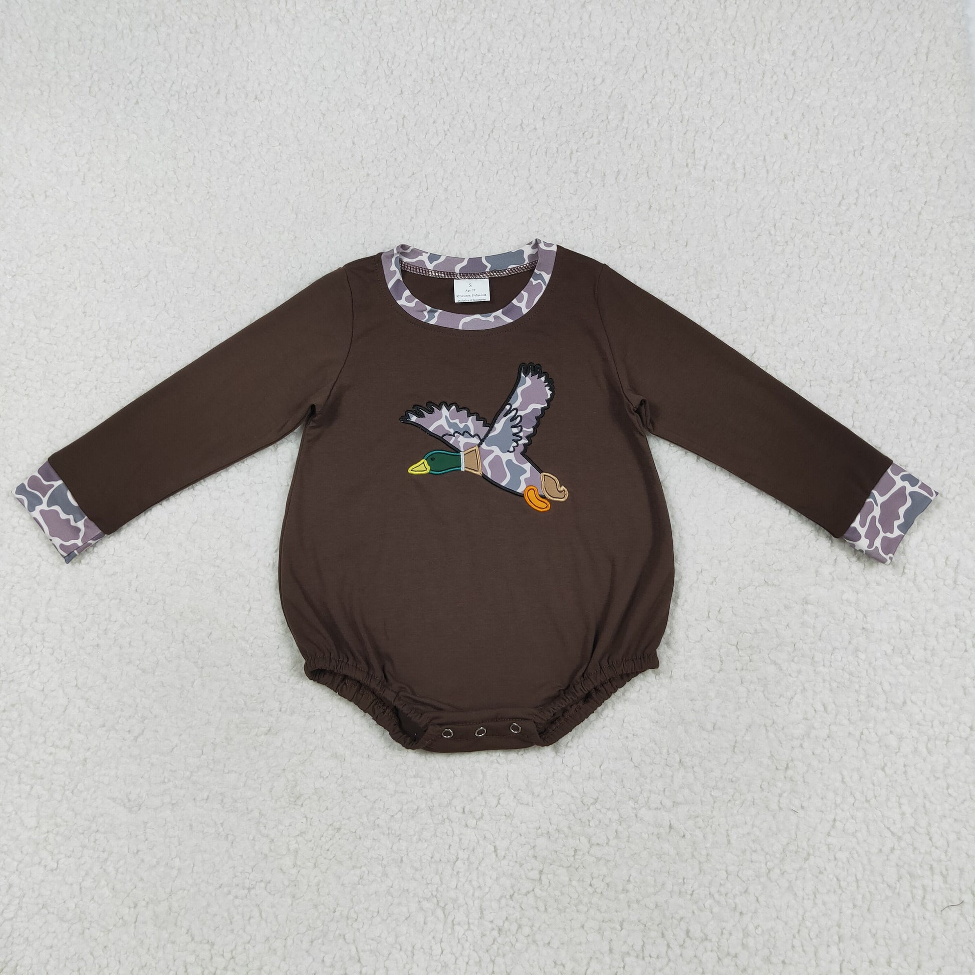 LR2310 Duck Embroidery Camo Brown Baby Boys Fall Bubble Romper