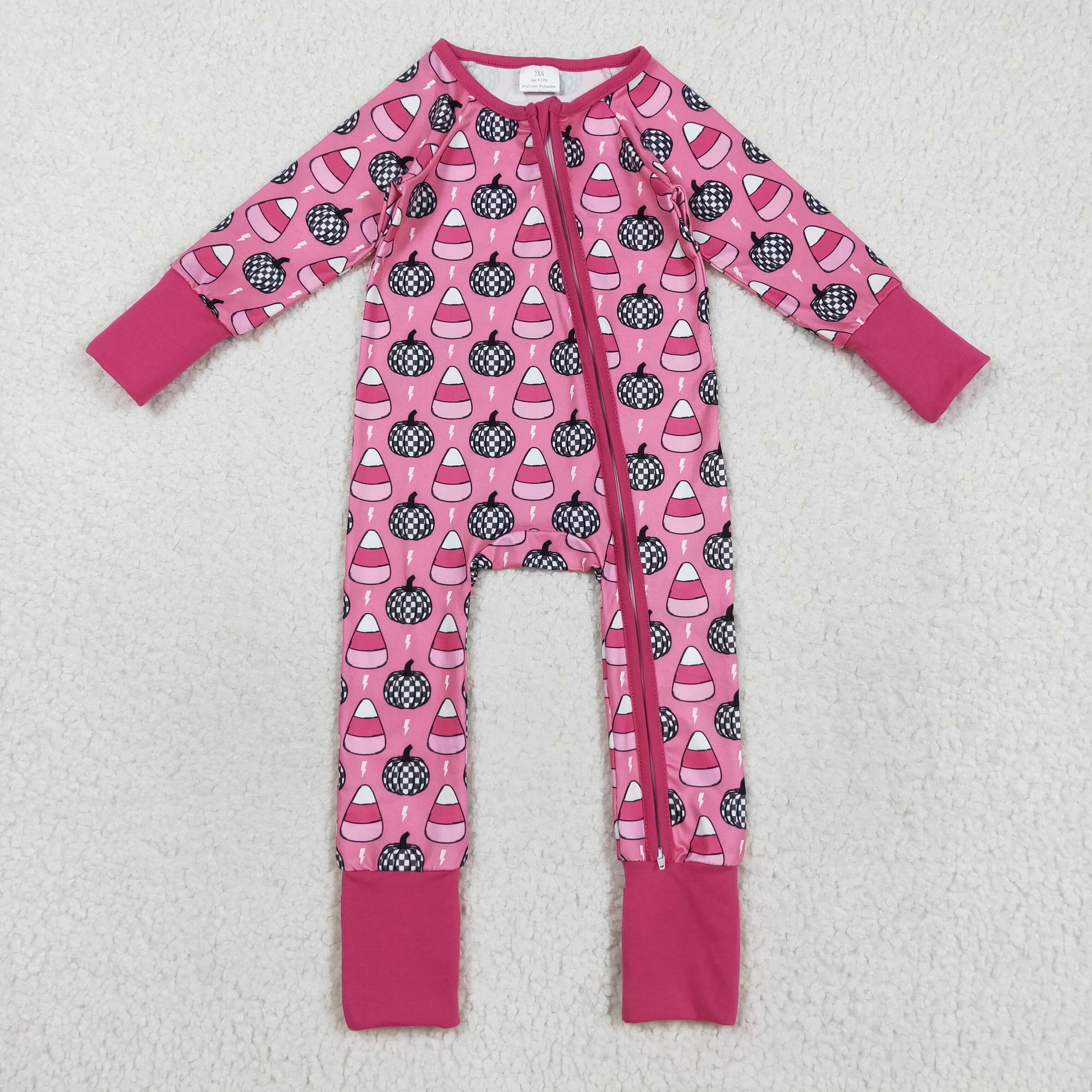 LR2467 Pumpkin Candy Pink Print Baby Girls Halloween Zipper Sleeper Romper
