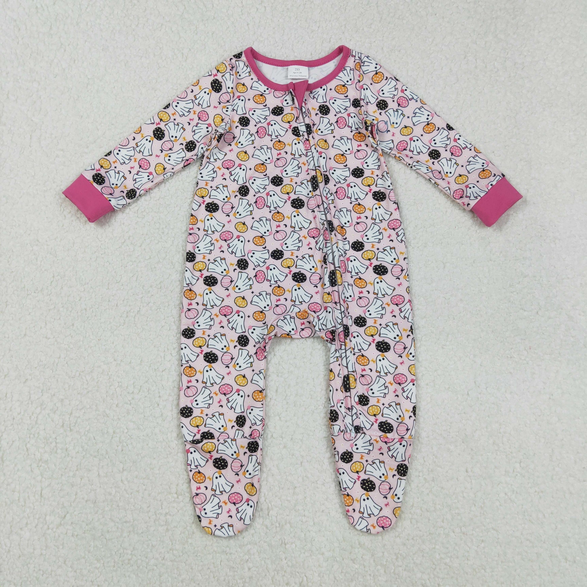 LR2506 Spooky Pumpkin Print Baby Girls Halloween Zipper Sleeper Romper