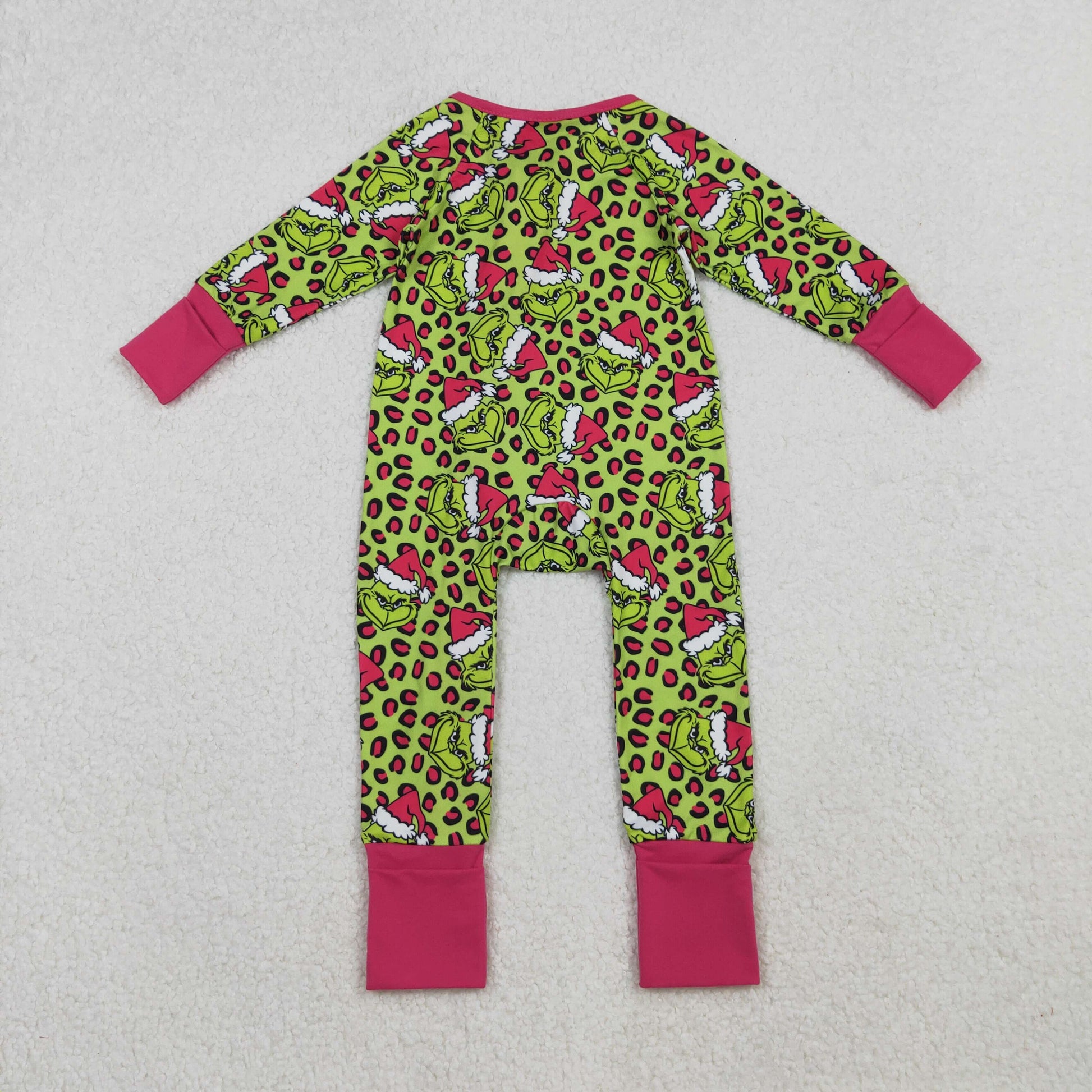 LR2520 Green Frog Leopard Print Baby Girls Christmas Zipper Sleeper Romper