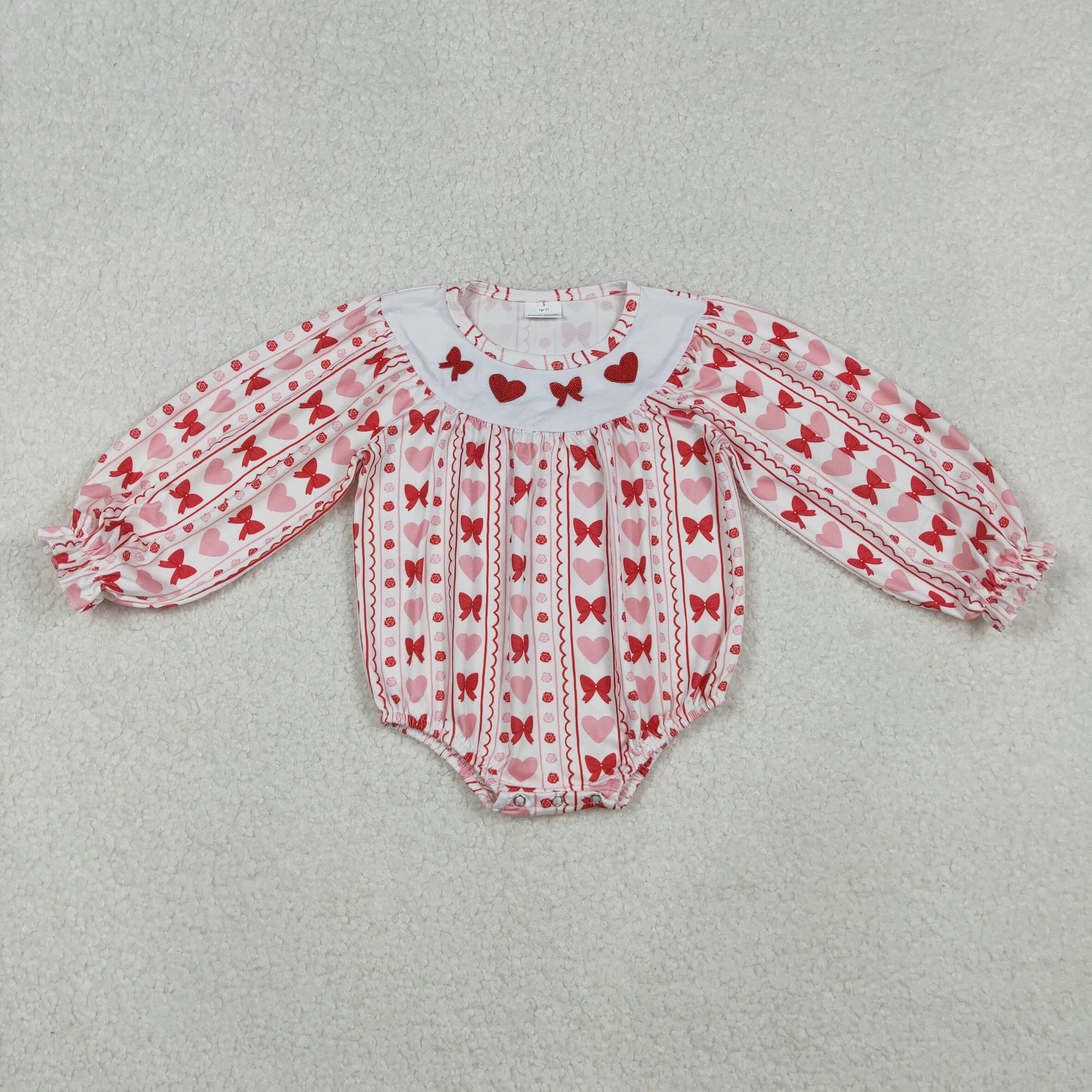 LR2696 Heart Bows Embroidery Pink Print Baby Girls Valentine's Day Bubble Romper