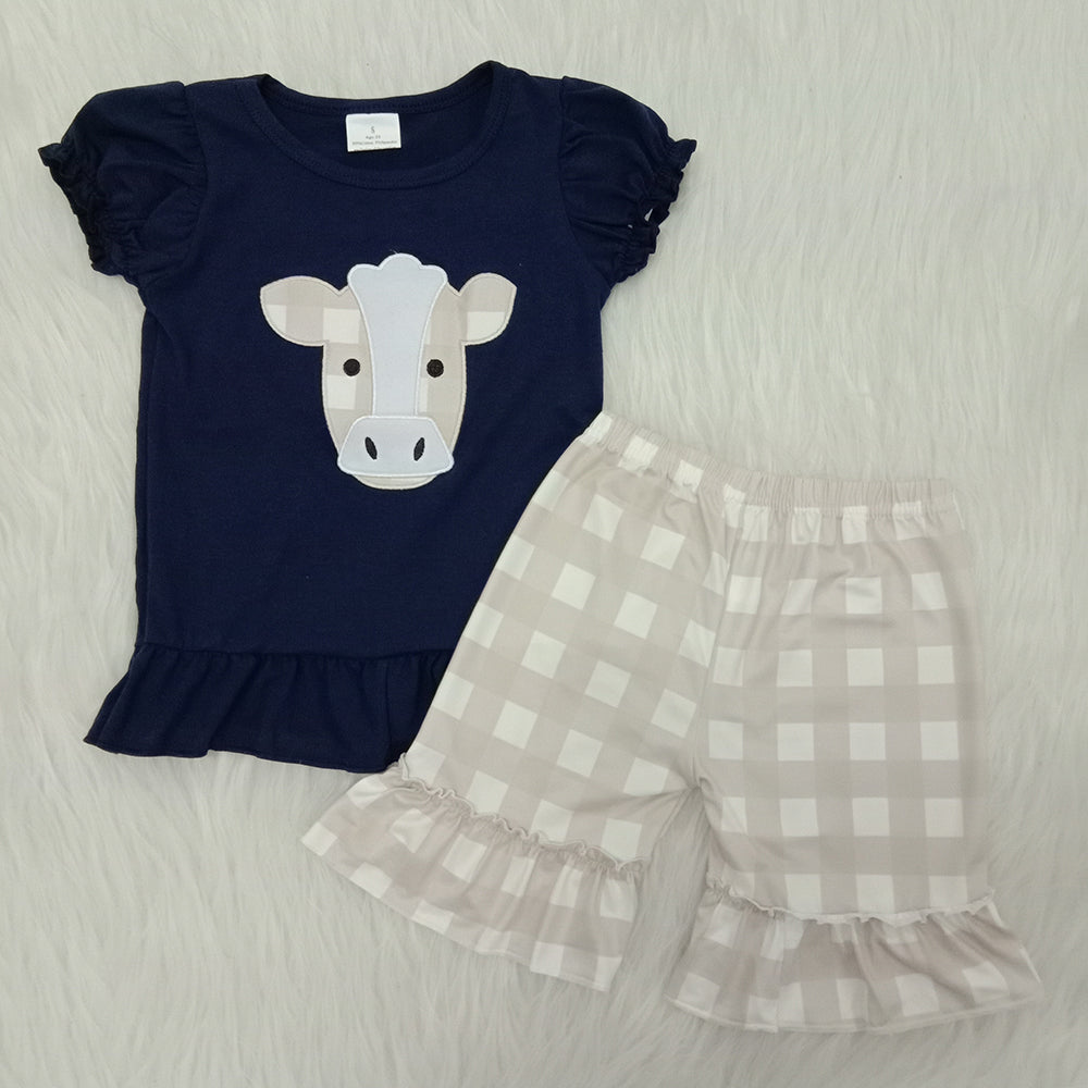 Navy cotton cow embroidery shirt plaid shorts girls clothing A4-14