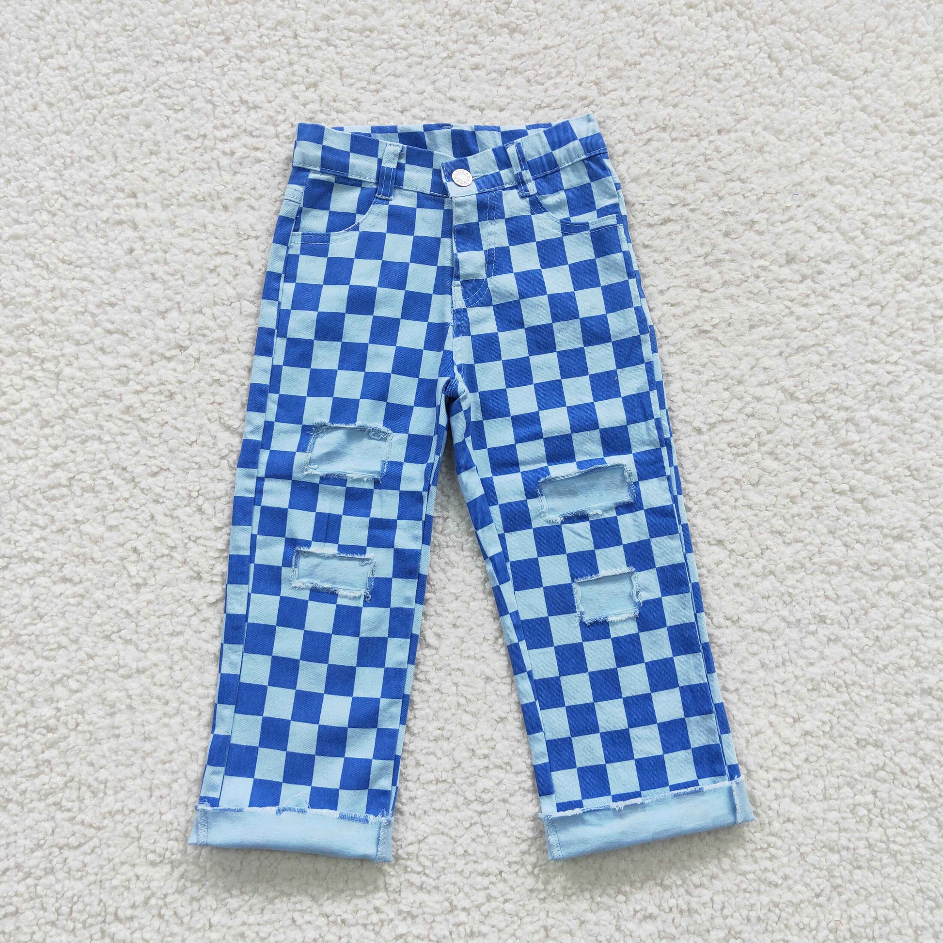 P0097 Kids blue plaid denim hole jeans