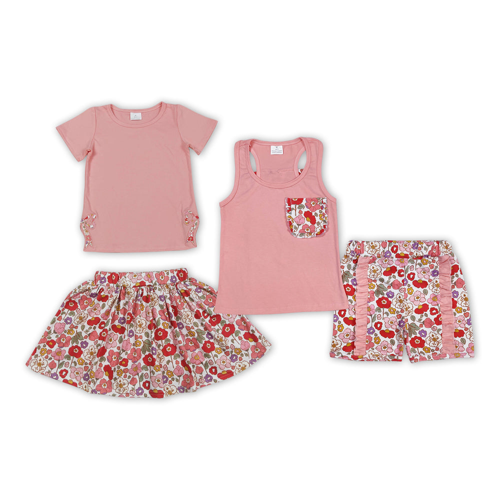 Pink Top Flowers Bottom Shorts Girls Summer Clothes Set Sisters Wear Outfits